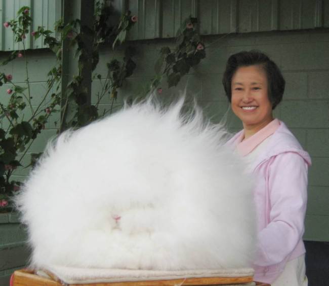 OK, so we didn't do a scientific study or anything, but this Angora rabbit is one of the fluffiest creatures you'll ever see. It's also been bred by humans for its long fur for a really long time. The Angora originates from Turkey and is considered the oldest domesticated rabbit. It became popular with French royalty in the mid-18th century, and first appeared in the U.S. in the early 20th century. They're bred largely for their long wool, which is removed by shearing, combing, or plucking. BETTY CHU