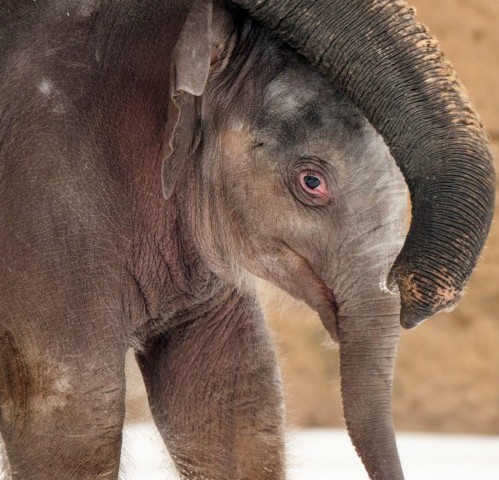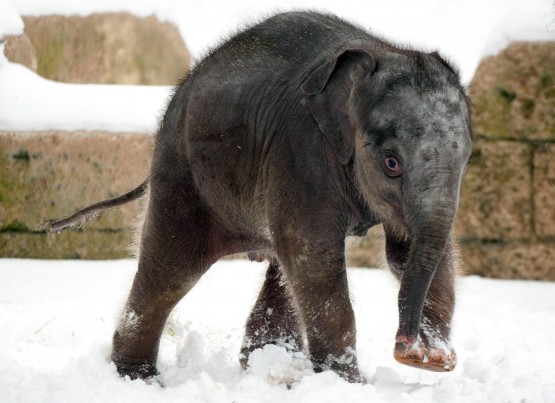 epa03553596 A four-week old still unnamed elephant calf walks with the herd in the snow at the zoo in Hanover, Germany, 24 January 2013. Hanover Zoo is expecting three more elephant calves this year. EPA/SEBASTIAN KAHNERT