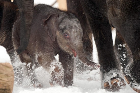 epa03553595 A four-week old still unnamed elephant calf walks with the herd in the snow at the zoo in Hanover, Germany, 24 January 2013. Hanover Zoo is expecting three more elephant calves this year. EPA/SEBASTIAN KAHNERT