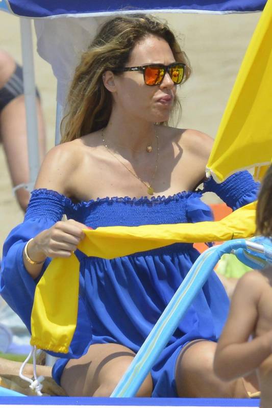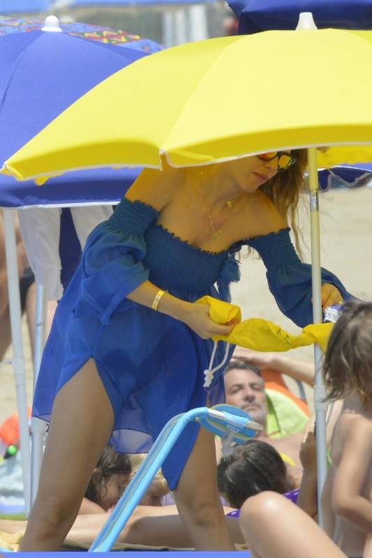 Look piuttosto insolito questa volta per Ilary Blasi, che non si mostra in costume in tutta la sua bellezza ma preferisce tenere addosso un copricostume blu con le spalle scoperte. Tuttavia risulta lo stesso bellissima e le sue forme mozzafiato si intravedono anche attraverso il copricostume.