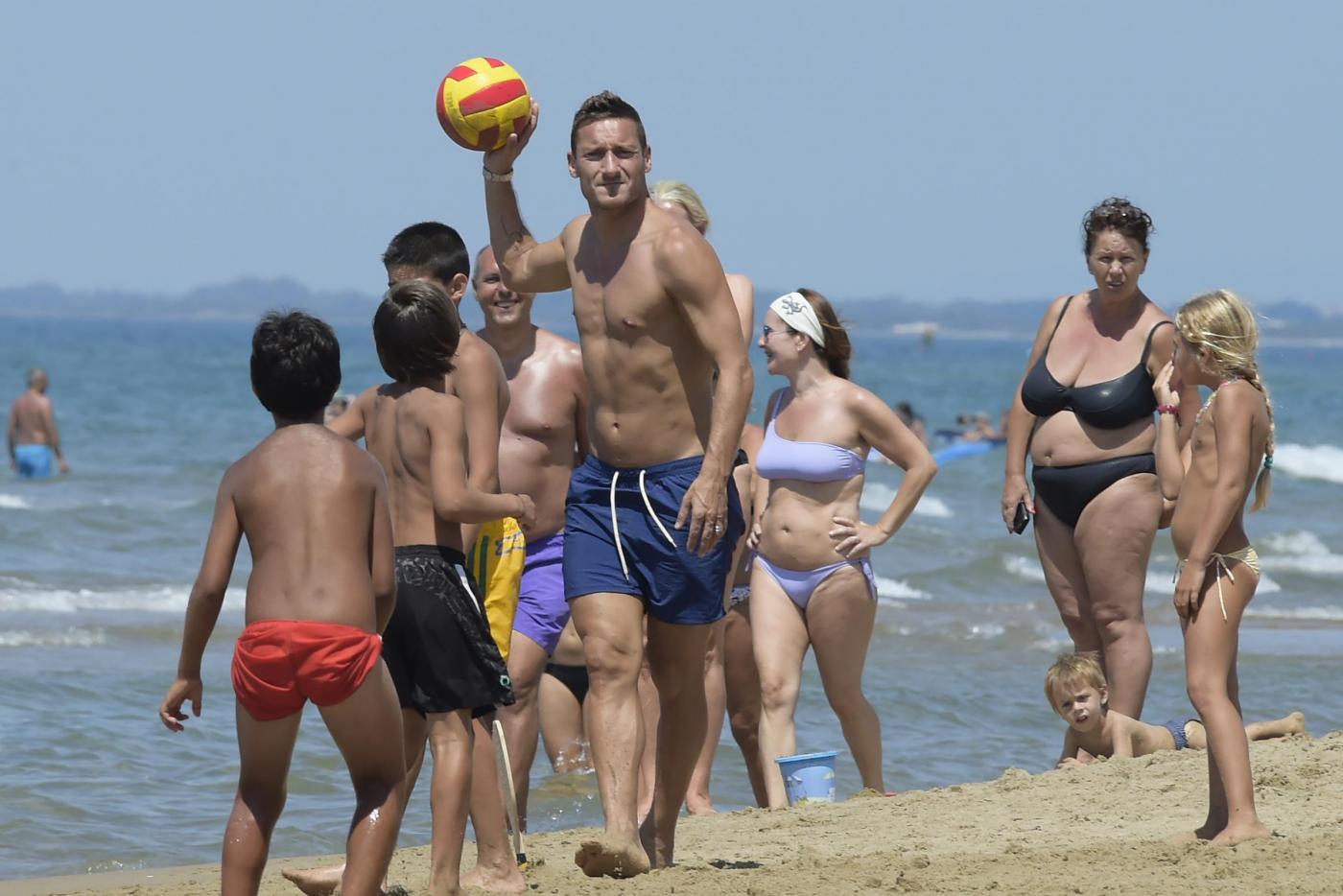 Francesco Totti, a Sabaudia con Ilary e i figli Cristian e Chanel, non rinuncia a una partitella a calcio sul bagnasciuga. Con pallone rigorosamente giallorosso.