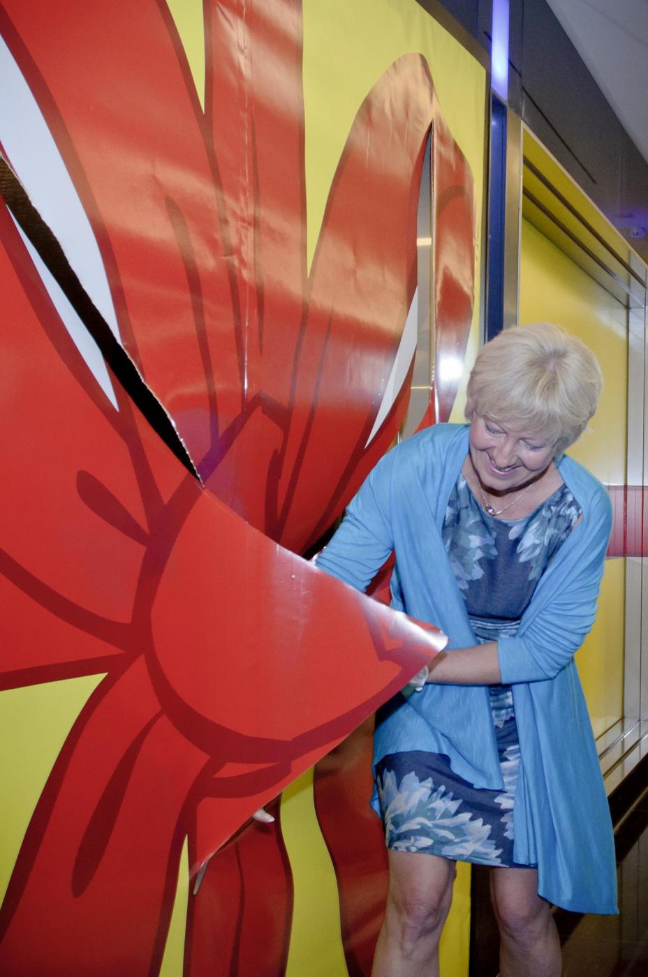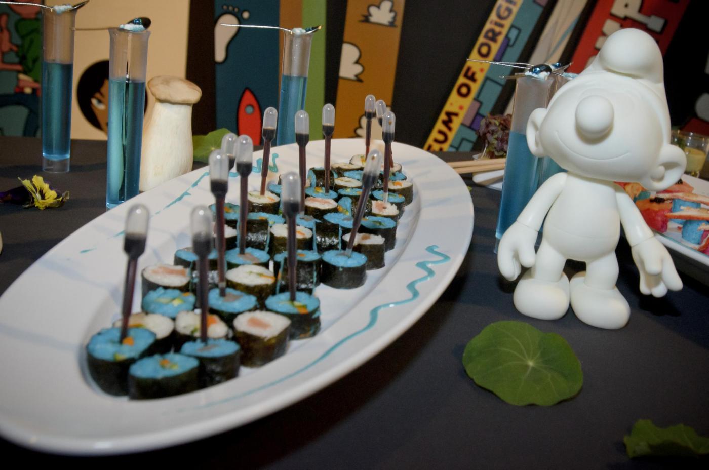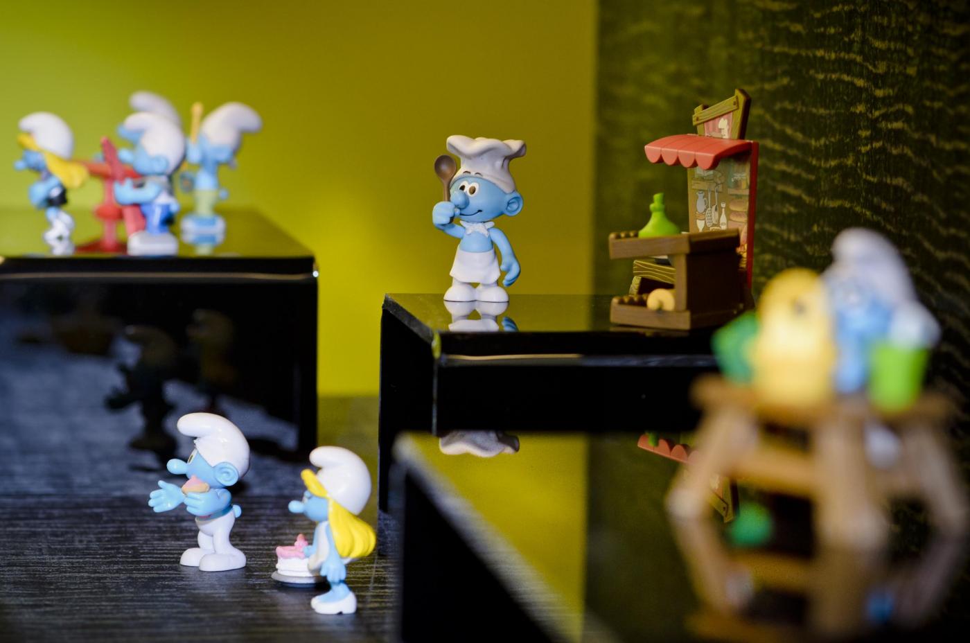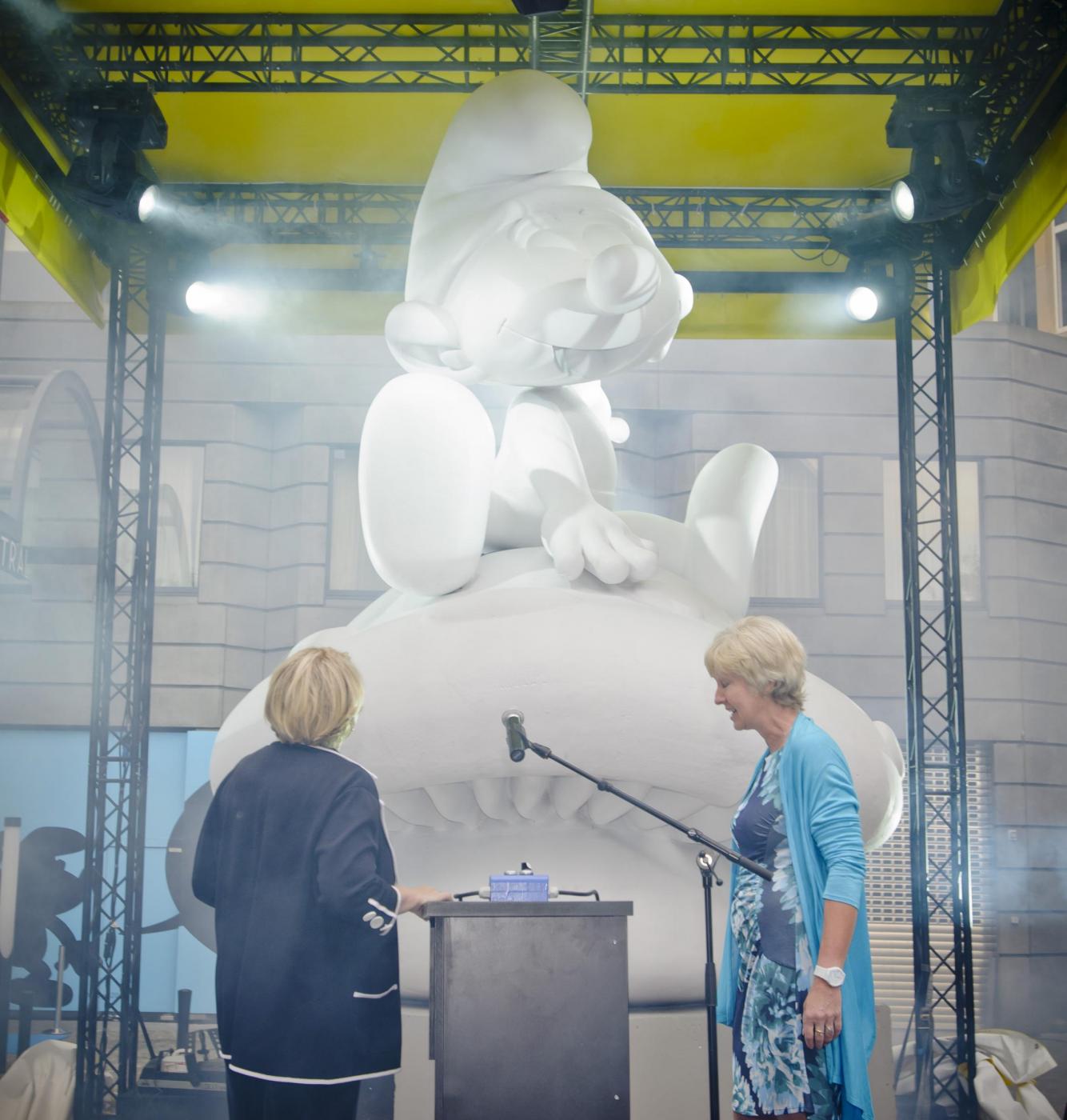 All’ingresso della Puffo-boutique, è stata collocata una statua di cinque metri che rappresenta un puffo seduto su un fungo, opera della scultrice Maryline Garbe (foto LaPresse):