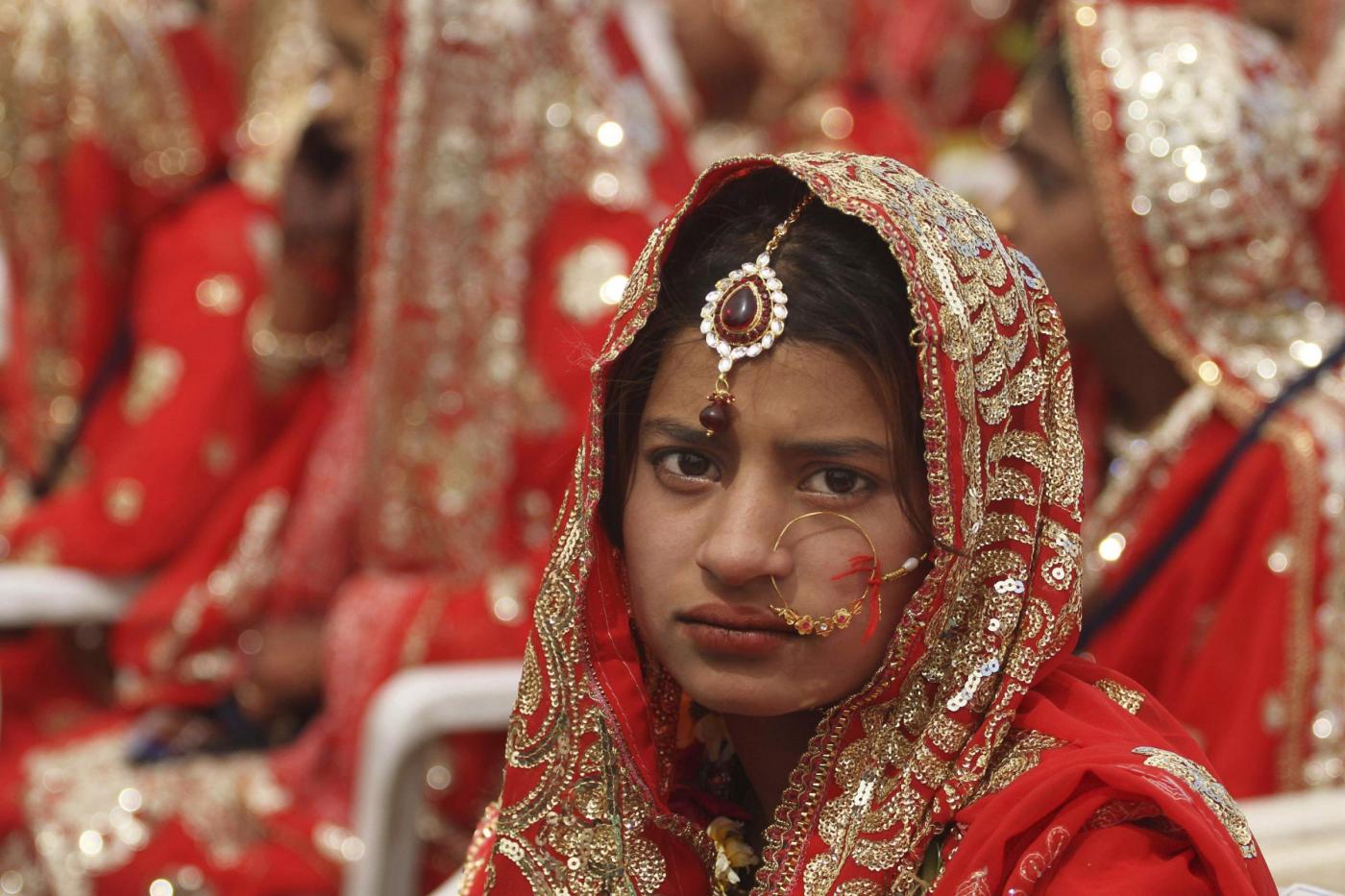 An Indian bride, sits during a mass marriage of 162 Muslim couples in Ahmadabad, India, Sunday, March 3, 2013. Mass marriages in India are organized by social organizations primarily to help the economically backward families who cannot afford the high ceremony costs as well as the customary dowry and expensive gifts that are still prevalent in many communities.(AP Photo/Ajit Solanki)(LaPresse/AP/Ajit Solanki)