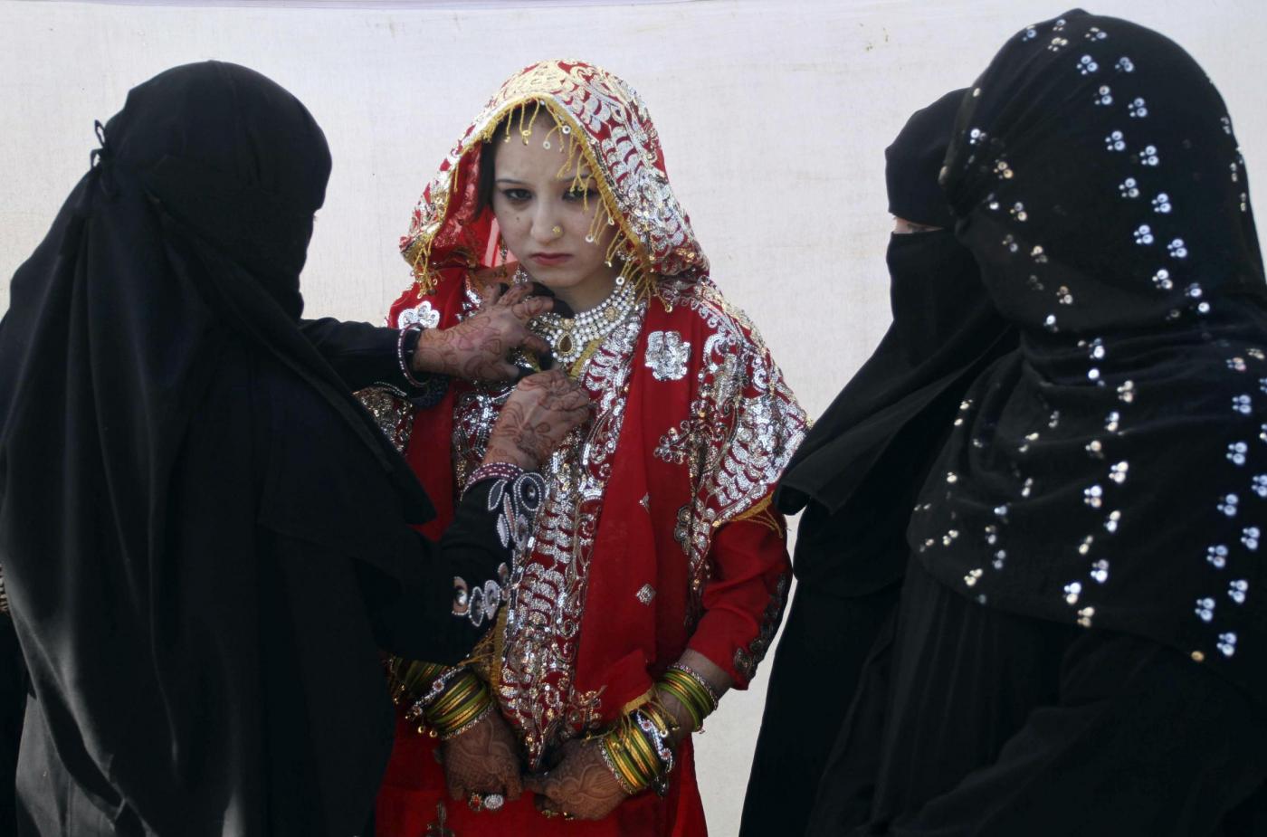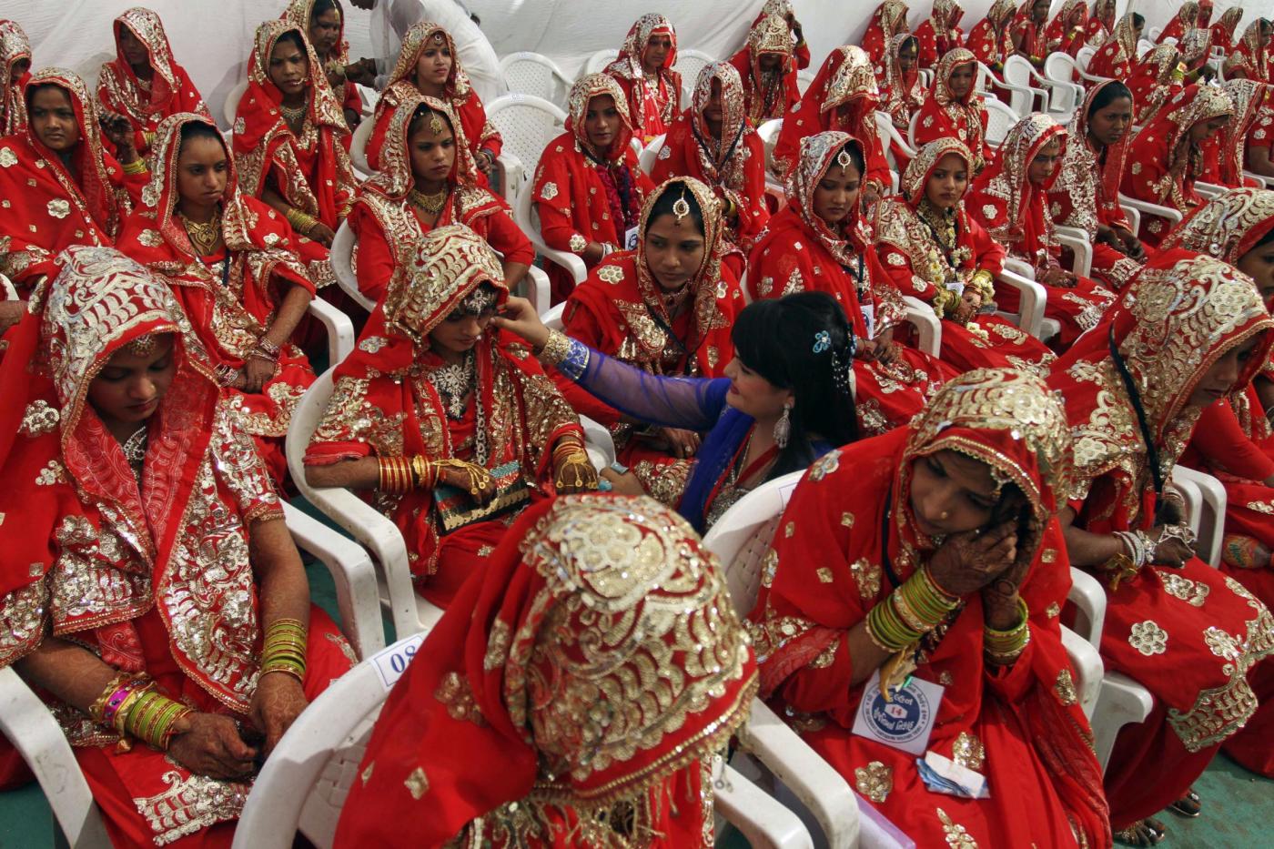 A relative, left, adjusts the costume of a bride during a mass marriage of 162 Muslim couples in Ahmadabad, India, Sunday, March 3, 2013. Mass marriages in India are organized by social organizations primarily to help the economically backward families who cannot afford the high ceremony costs as well as the customary dowry and expensive gifts that are still prevalent in many communities.(AP Photo/Ajit Solanki)(LaPresse/AP/Ajit Solanki)