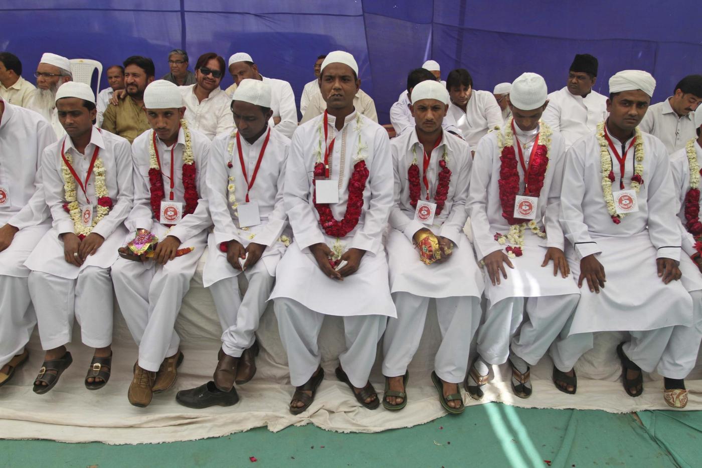 Indian grooms, front, sit during a mass marriage of 162 Muslim couples in Ahmadabad, India, Sunday, March 3, 2013. Mass marriages in India are organized by social organizations primarily to help the economically backward families who cannot afford the high ceremony costs as well as the customary dowry and expensive gifts that are still prevalent in many communities.(AP Photo/Ajit Solanki)(LaPresse/AP/Ajit Solanki)