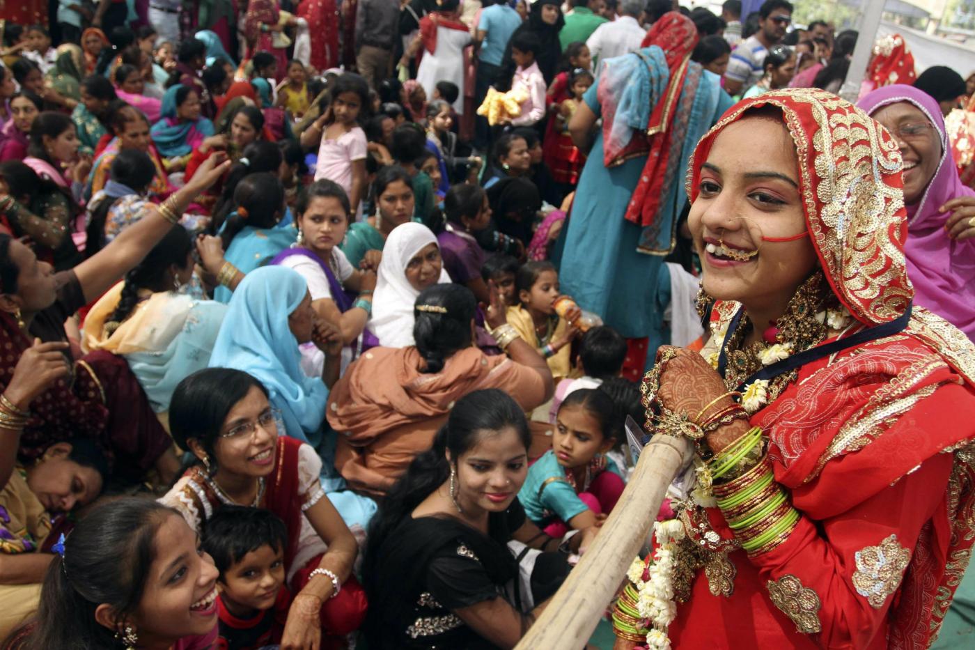 An Indian bride, right, interacts with a relative during a mass marriage of 162 Muslim couples in Ahmadabad, India, Sunday, March 3, 2013. Mass marriages in India are organized by social organizations primarily to help the economically backward families who cannot afford the high ceremony costs as well as the customary dowry and expensive gifts that are still prevalent in many communities.(AP Photo/Ajit Solanki)(LaPresse/AP/Ajit Solanki)