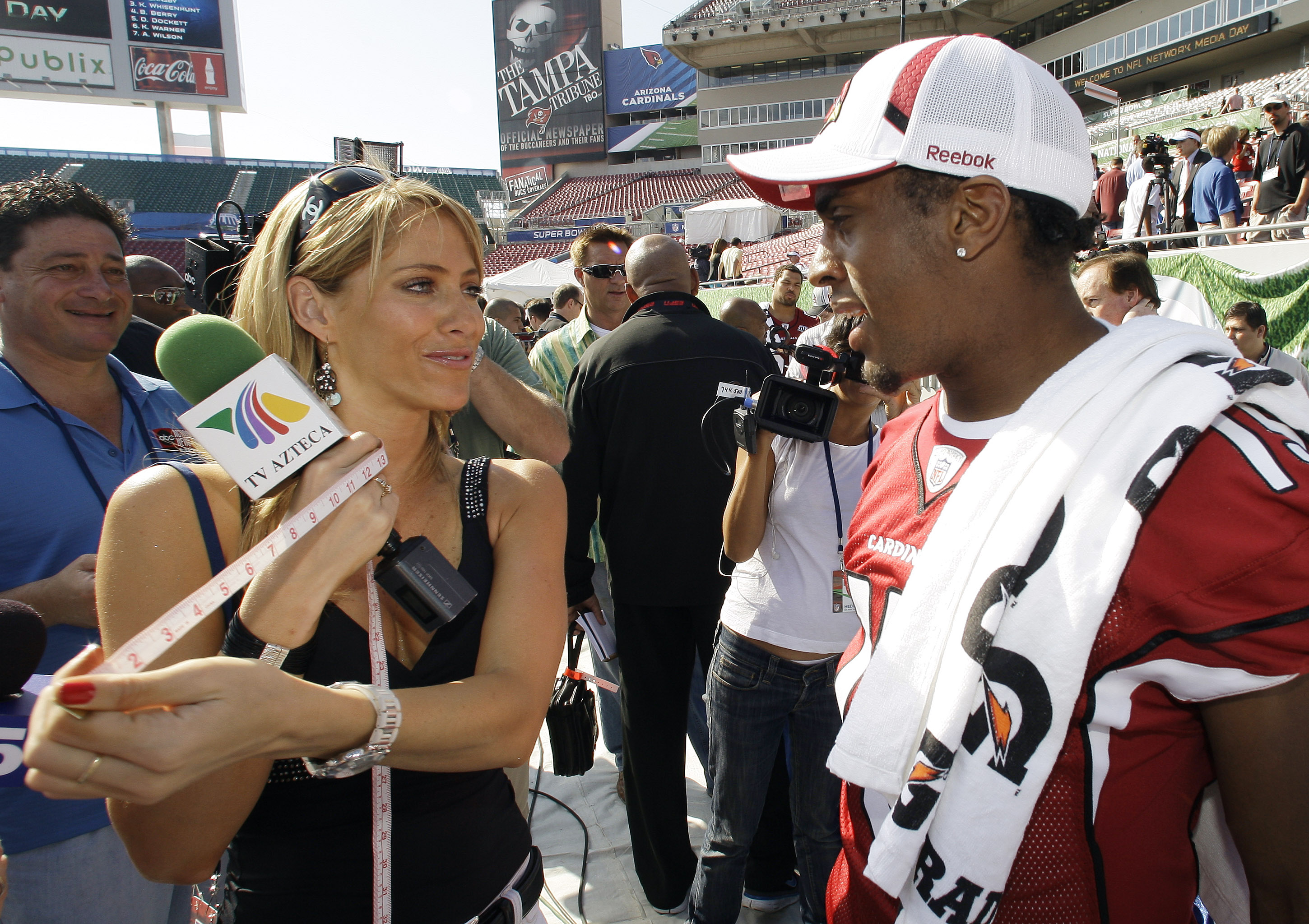 Ines nel 2010 (LaPresse) FILE - This Jan. 27, 2009, file photo shows TV Azteca reporter Ines Sainz, left, after measuring the bicep of Arizona Cardinals wide receiver Steve Breaston, right, during the team's media day for Super Bowl XLIII, in Tampa, Fla. Sainz says on her Twitter account she felt "very uncomfortable!" at a Jets practice Saturday where a coach appeared to throw footballs in her direction and players called out to her in the locker room. (AP Photo/Ross D. Franklin, File)