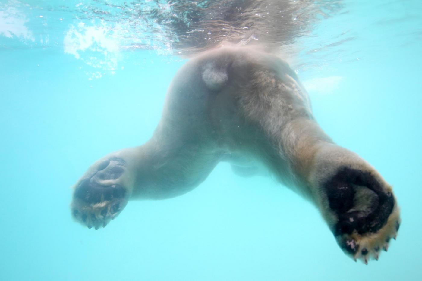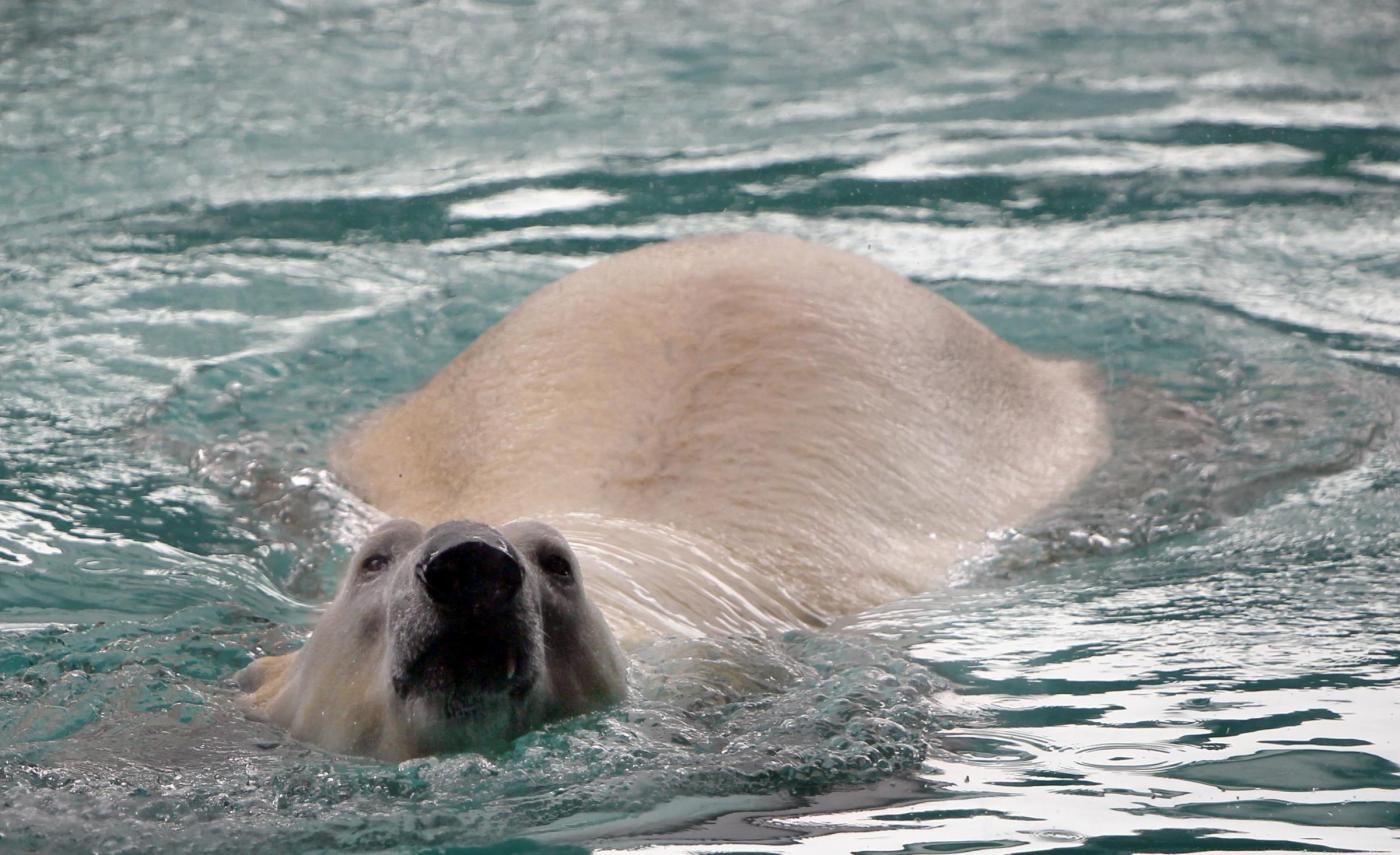 Inuka, the first polar bear born in the tropics swims in his new enclosure at the Singapore Zoo on Wednesday, May 29, 2013 in Singapore. Modeled closely after the arctic habitat, the enclosure helps replicate the chilly climate of the arctic by including an ice cave, and a large pool filled with giant ice blocks. These are part of the Wildlife Reserves Singapore's efforts in providing visitors greater knowledge of the natural world. (AP Photo/Wong Maye-E)