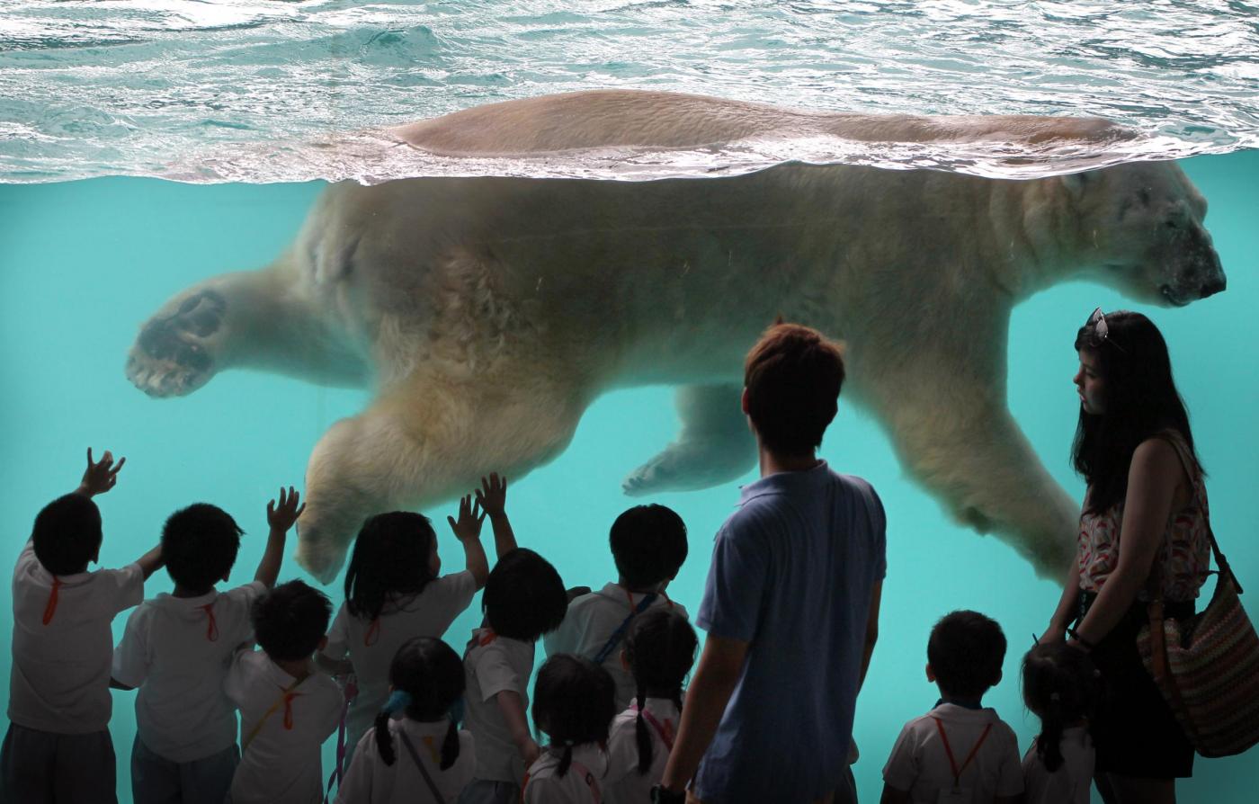 Inuka è un orso polare che vive nello zoo di Singapore. L’orso mangia frutta ghiacciata e nuota nella grande vasca piena di blocchi di ghiaccio giganti. Lo zoo di Singapore è riuscito a ricreare un’habitat artico, replicando lo stesso clima freddo.