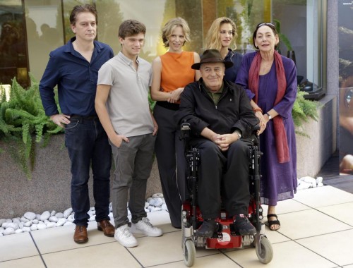 Top row from left, actors Tommaso Ragno, Jacopo Olmo, Sonia Bergamasco, Tea Falco and Veronica Lazar pose with director Bernardo Bertolucci during a photo call to promote his film ''Io e Te'', (Me and You), in Rome, Thursday, Oct. 18, 2012. (AP Photo/Andrew Medichini)