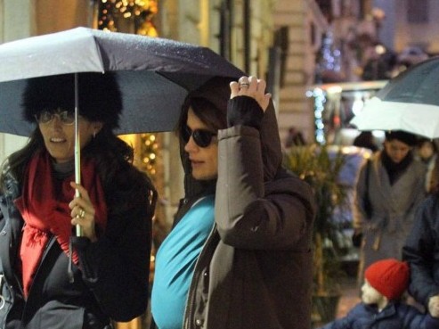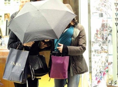 Alla vista dei fotografi, Irene si fa proteggere da una amica con un ombrello (LaPresse)