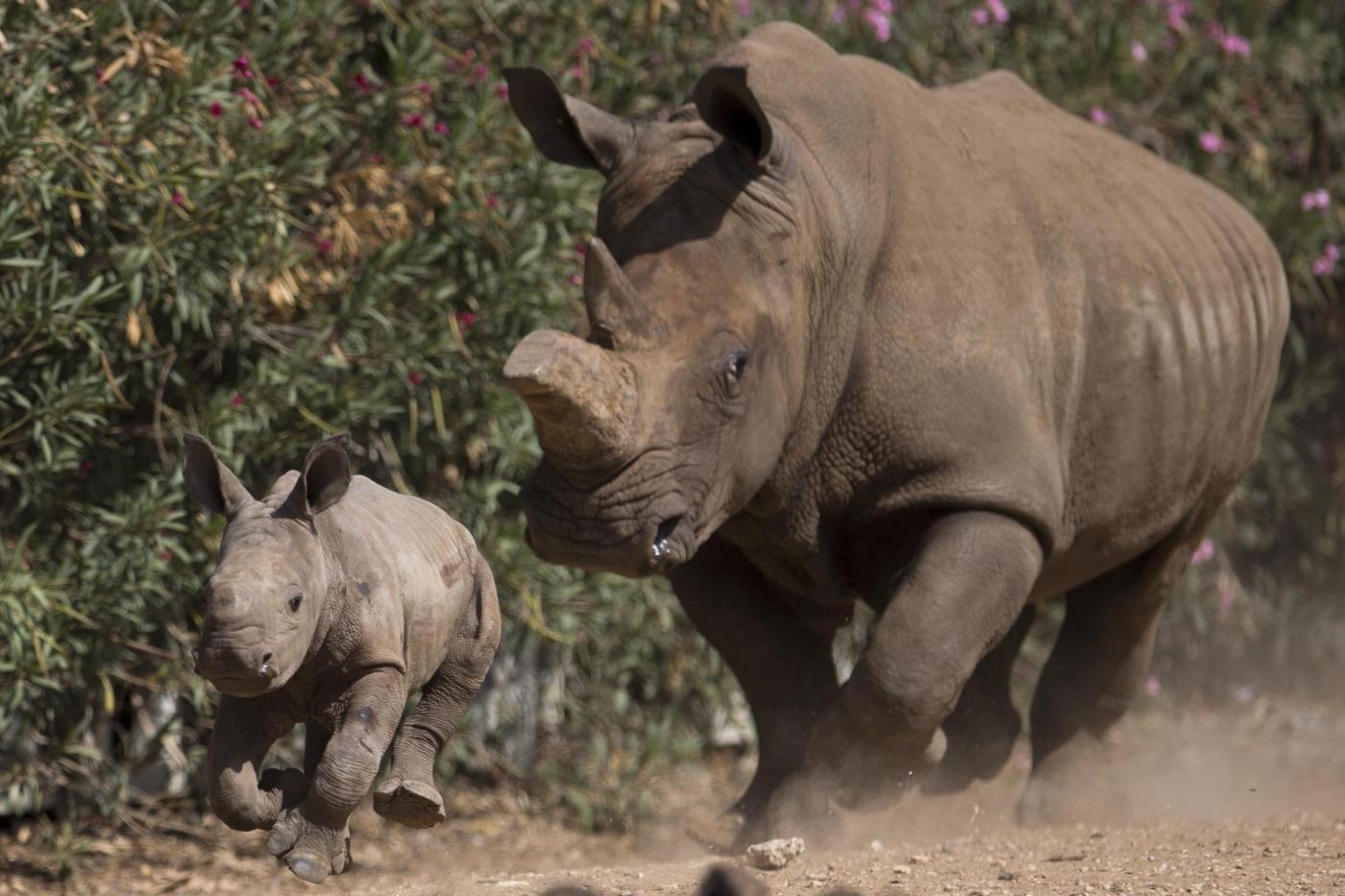 A newly born female White Rhino runs alongside her mother Tanda in Ramat Gan Safari Park near Tel Aviv, Israel, Wednesday, Sept. 3, 2014. She was born three weeks ago, after more than twenty years without a female White Rhino birth in the Safari, Sagit Horowitz, the safari spokeswoman said.(AP Photo/Ariel Schalit)