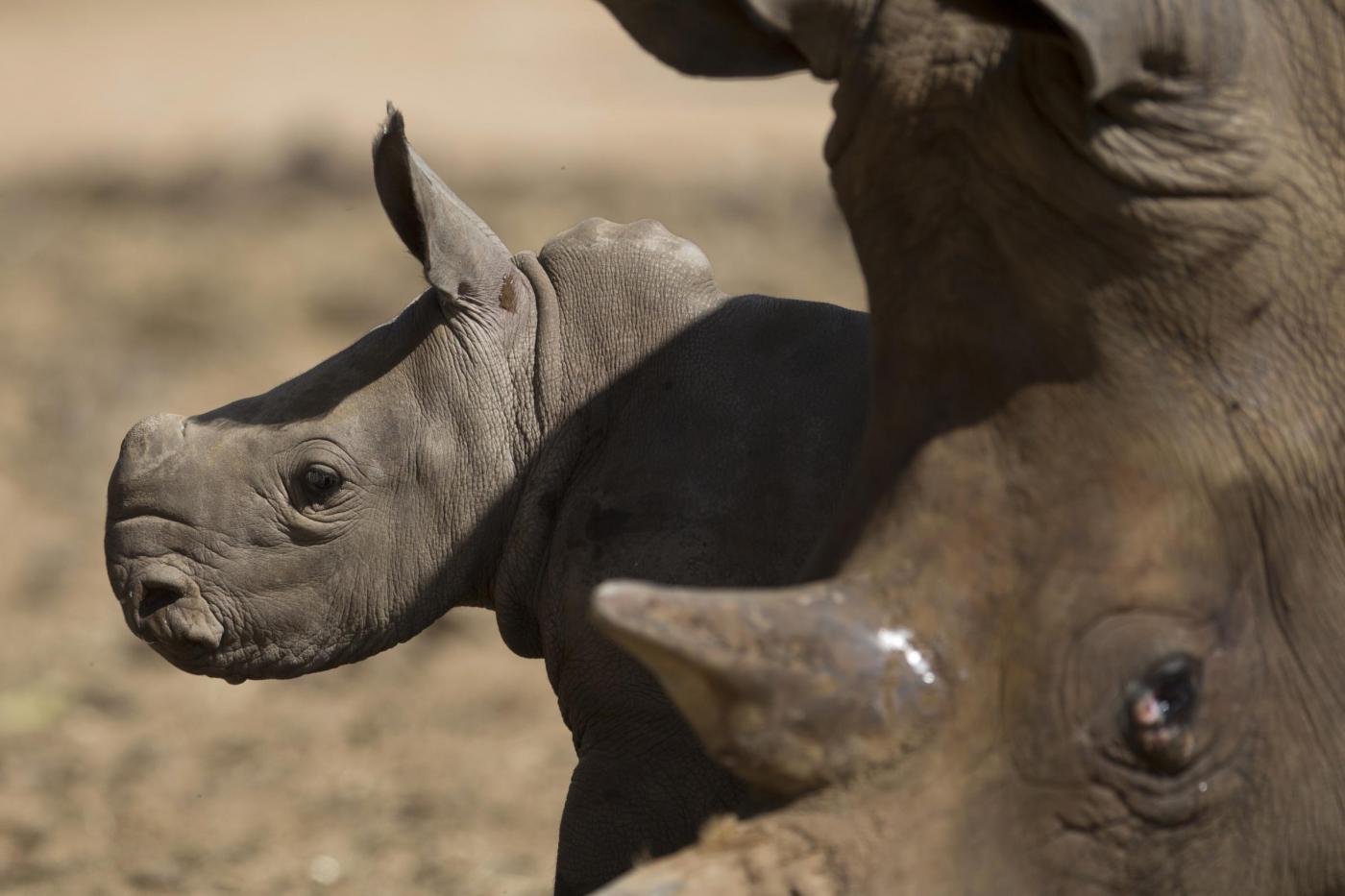 A newly born female White Rhino, stands besides her mother Tanda in Ramat Gan Safari Park near Tel Aviv, Israel, Wednesday, Sept. 3, 2014. She was born three weeks ago, after more than twenty years without a female White Rhino birth in the Safari, Sagit Horowitz, the safari spokeswoman said.(AP Photo/Ariel Schalit)