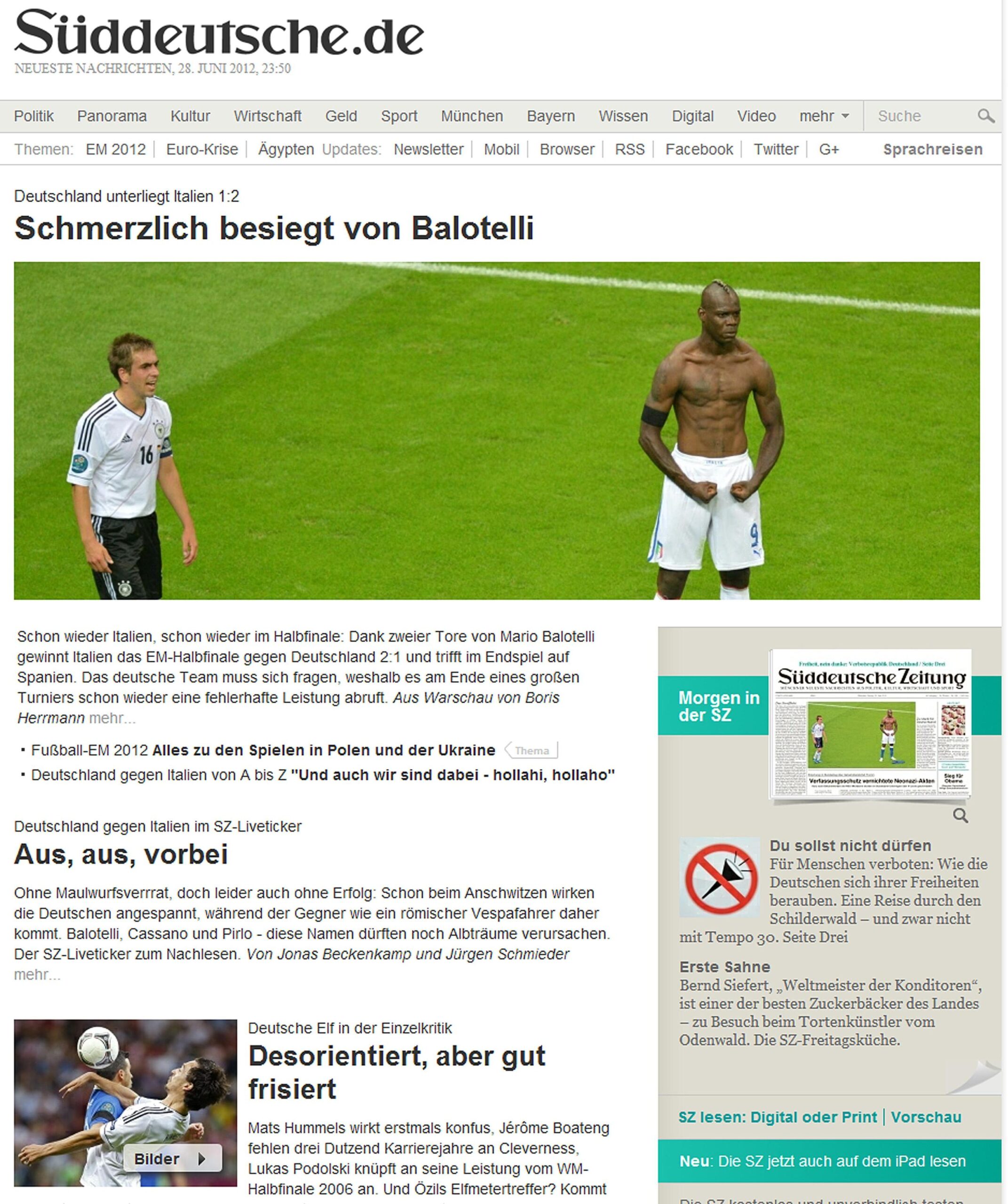 La pagina web del 'Suddeutsche.de'La pagina web del 'Suddeutsche.de' dà notizia del successo dell'Italia sulla Germania agli Europei di calcio, 29 giugno 2012.