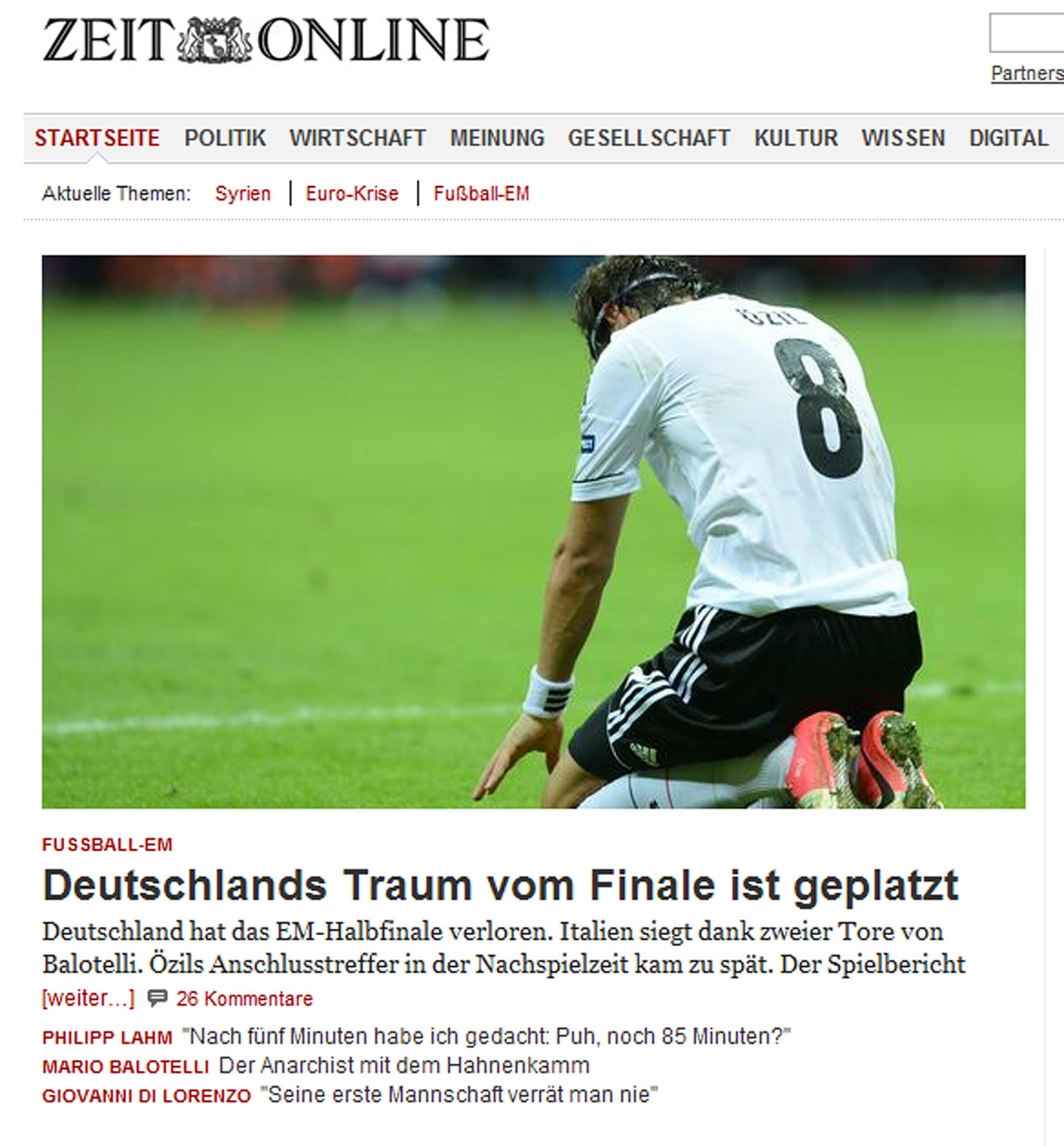 La pagina web del 'Zeit on line'La pagina web del 'Zeit on line' dà notizia del successo dell'Italia sulla Germania agli Europei di calcio, 29 giugno 2012
