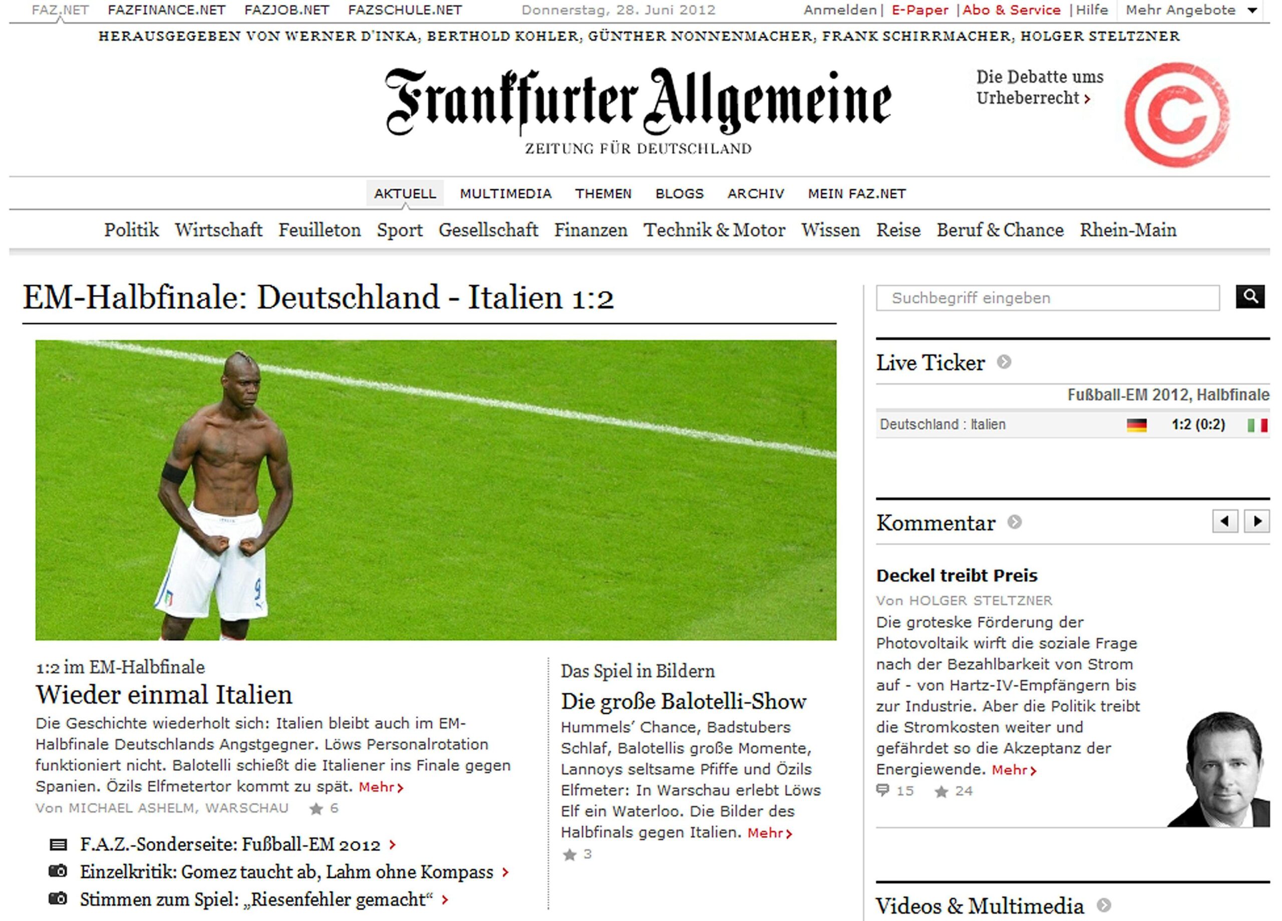 La pagina web del 'Frankfurter Allgemeine' La pagina web del 'Frankfurter Allgemeine' dà notizia del successo dell'Italia sulla Germania agli Europei di calcio, 29 giugno 2012