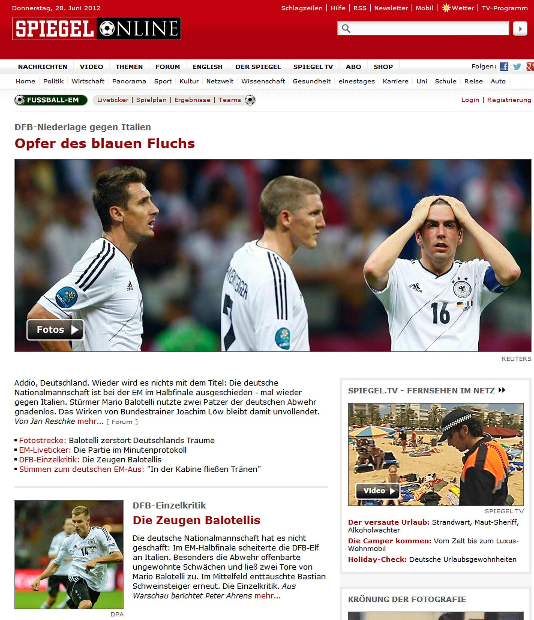 La pagina web del 'Spiegel on line' La pagina web del 'Spiegel on line' dà notizia del successo dell'Italia sulla Germania agli Europei di calcio, 29 giugno 2012