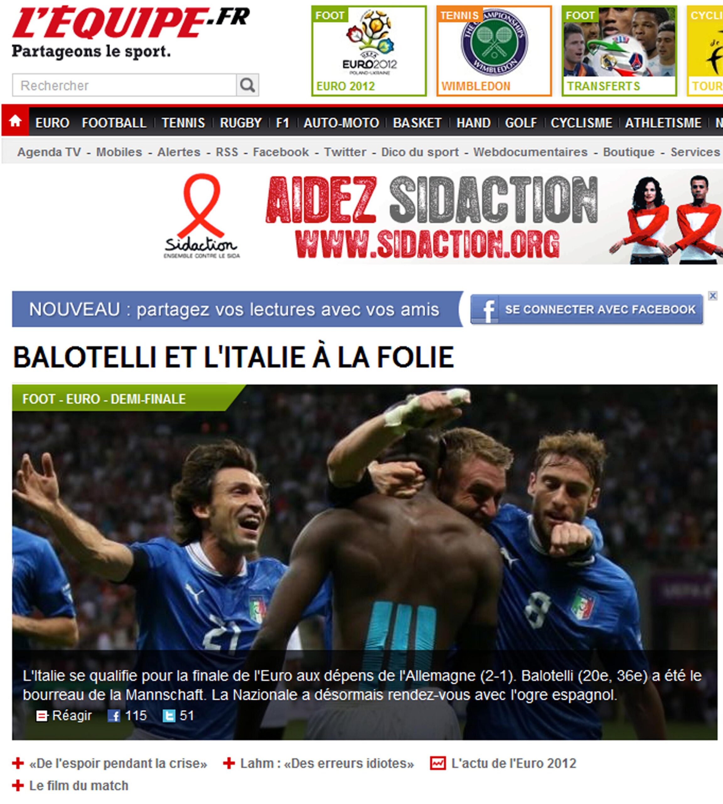 La pagina web dell'Equipe' La pagina web dell'Equipe' dà notizia del successo dell'Italia sulla Germania agli Europei di calcio, 29 giugno 2012