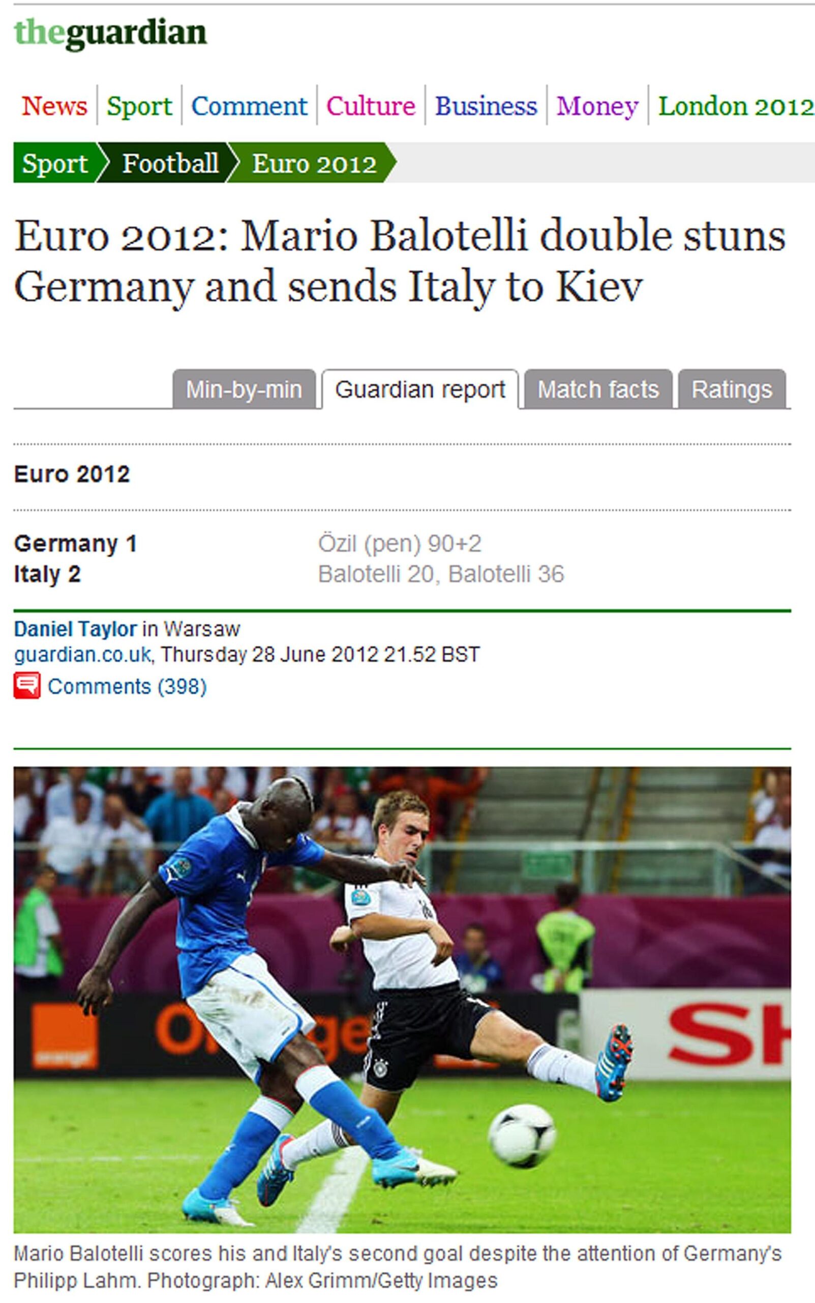 La pagina web del 'Guadian'La pagina web del 'Guadian' dà notizia del successo dell'Italia sulla Germania agli Europei di calcio, 29 giugno 2012