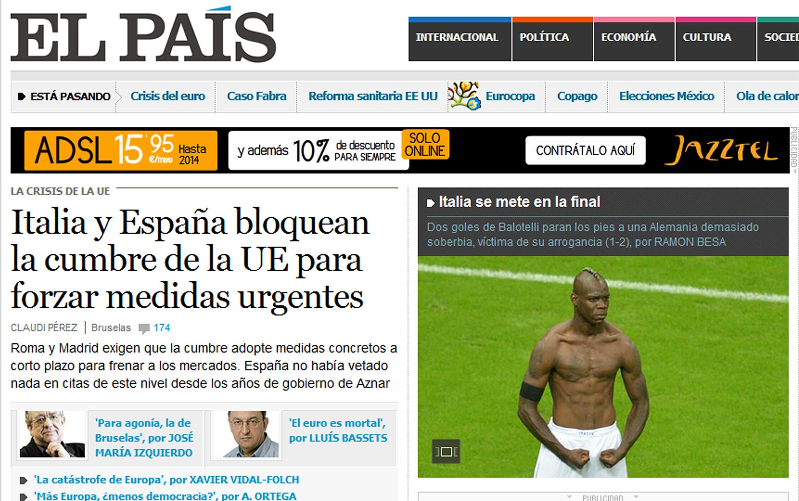 La pagina web del 'Pais'La pagina web del 'Pais' dà notizia del successo dell'Italia sulla Germania agli Europei di calcio, 29 giugno 2012