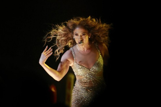 Sul palco, la ex moglie di Marc Anthony indossava una tutina striminzita “vedo non vedo” (più “vedo” che “non vedo”) illuminato da una pioggia di paillettes argentate. Ai piedi, la Lopez indossa delle scarpe con la zeppa dello stesso colore dell’abito (foto Ap/LaPresse)