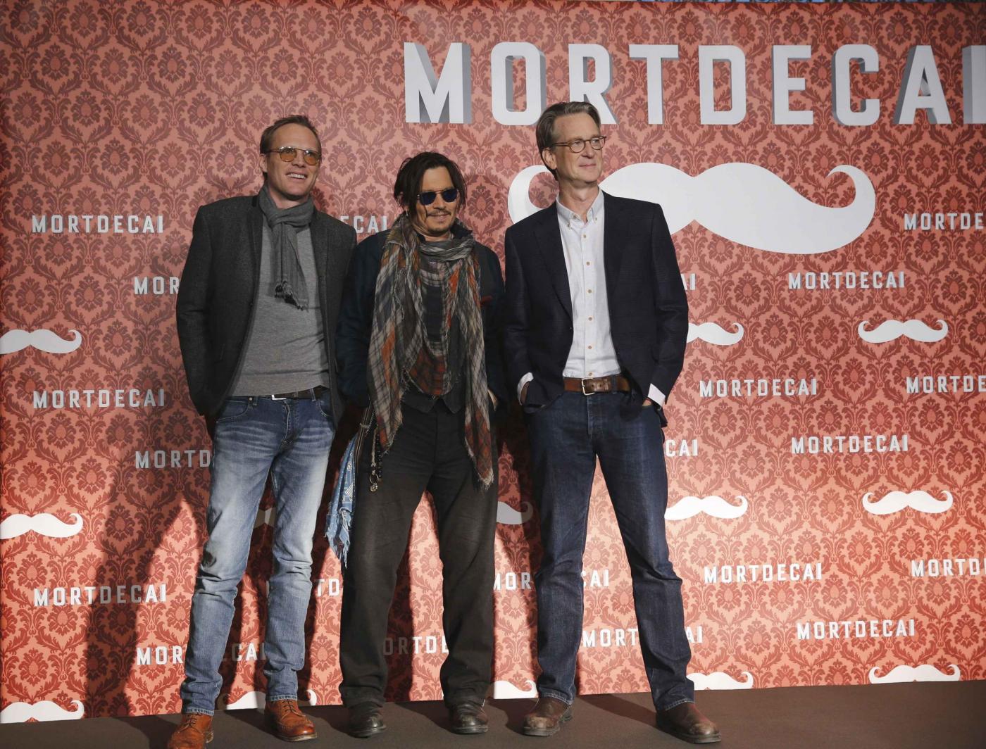 Cast members Paul Bettany (L-R), Johnny Depp and director David Koepp attend a photocall to promote the world premiere of their film 'Mortdecai' in Berlin, January 18, 2015. REUTERS/Fabrizio Bensch (GERMANY - Tags: ENTERTAINMENT)
