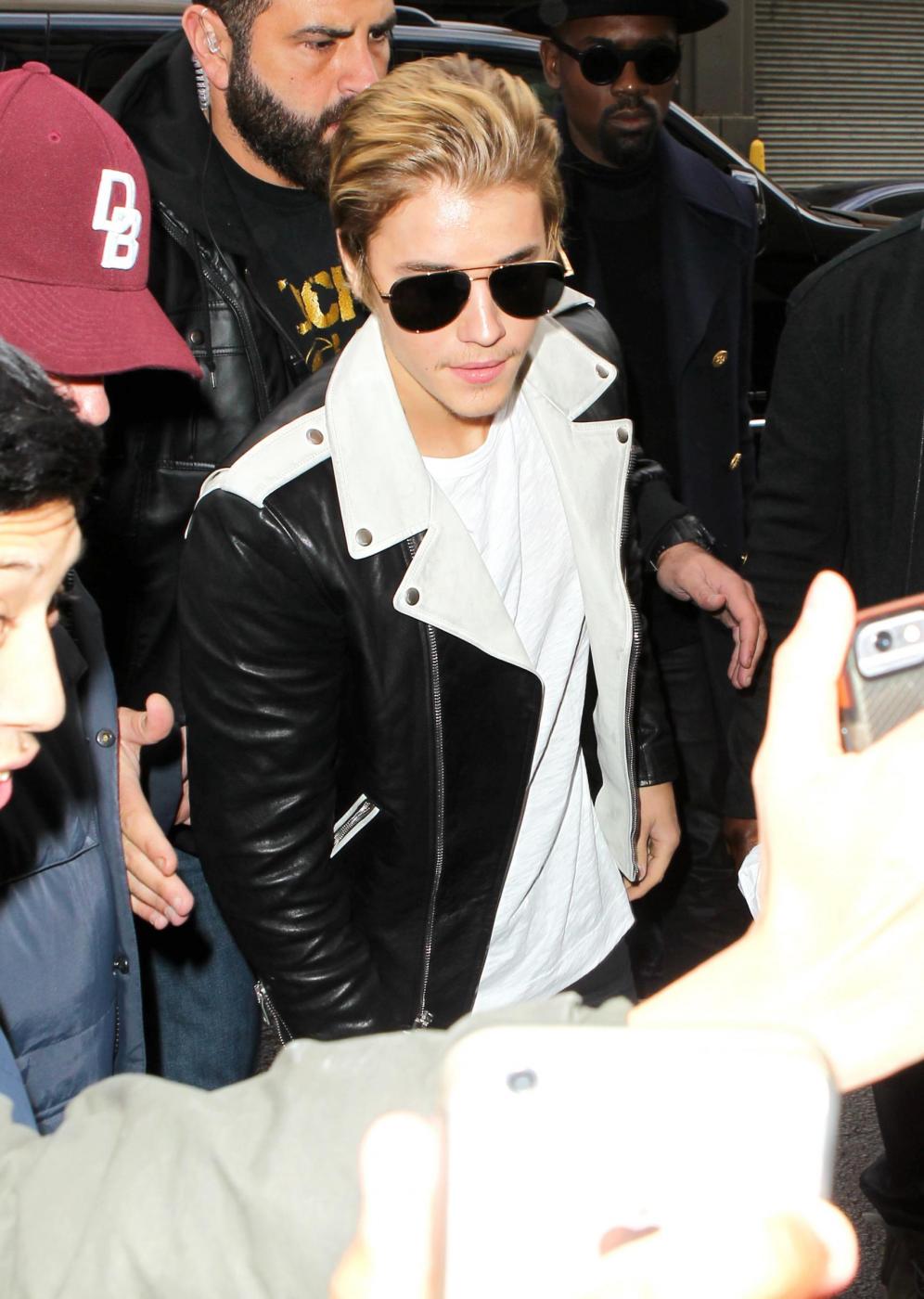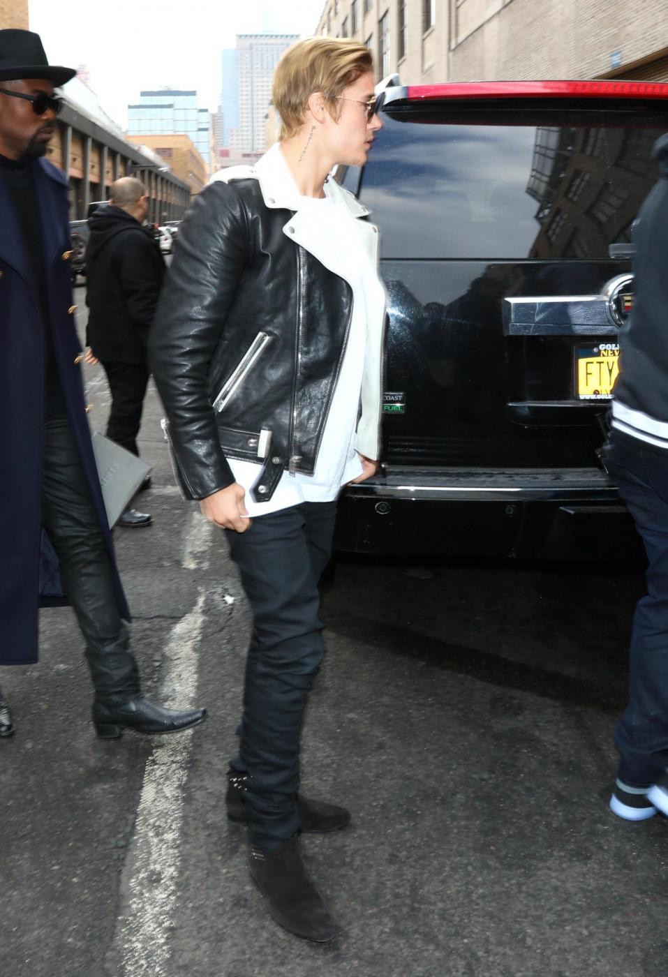Justin Bieber alla sfilata di Kanye WestJustin Bieber was looking quite stylish for Kanye West's fashion show in New York City. The pop star was wearing aviator shades and a black and white leather jacket. X17online.com LaPresse -- Only Italy