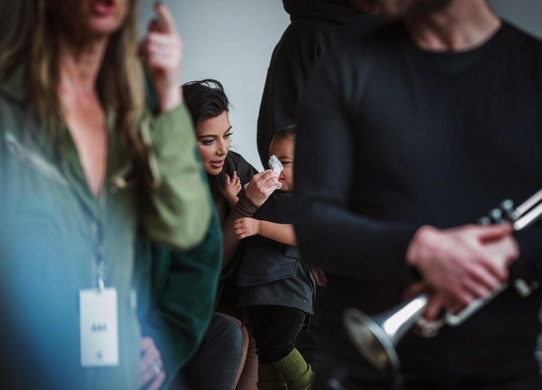 La performance è stata orchestrata da Vanessa Beecroft, artista italiana famosa per le sue coreografie accompagnate anche da musica e luci. Il pianto della bimba, ad un certo ha costretto mamma Kim a portare la piccola dietro le quinte. Ed anche papà Kanye, è stato viene immortalato per un attimo mentre consola la figlia, prima di raggiungere i modelli sul palco e salutare il pubblico.