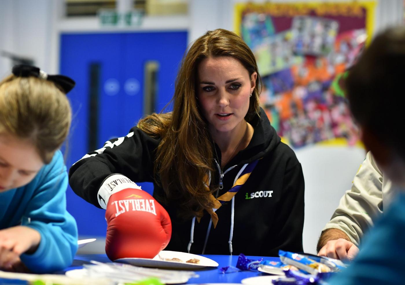 The Duchess of Cambridge learns about disability by wearing a boxing glove to handle a fork as she meets with children at the newly established 23rd Poplar Beaver Scout Colony in east London. PRESS ASSOCIATION Photo. Picture date: Tuesday December 16, 2014. Kate’s visit supports the Scout Association's 'Better Prepared' campaign, which aims to help communities to deliver Scouting to two hundred locations across the UK where Scouting can have the biggest impact. Photo credit should read: Ben Stansall/PA Wire