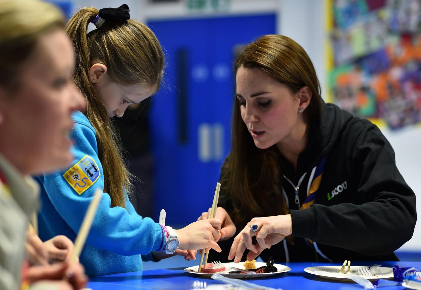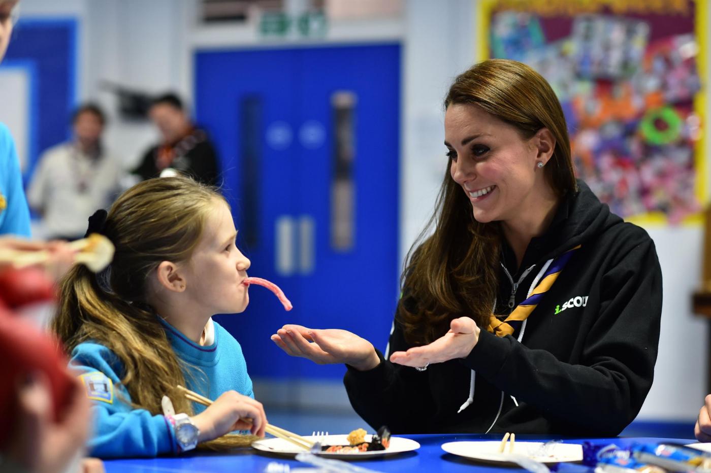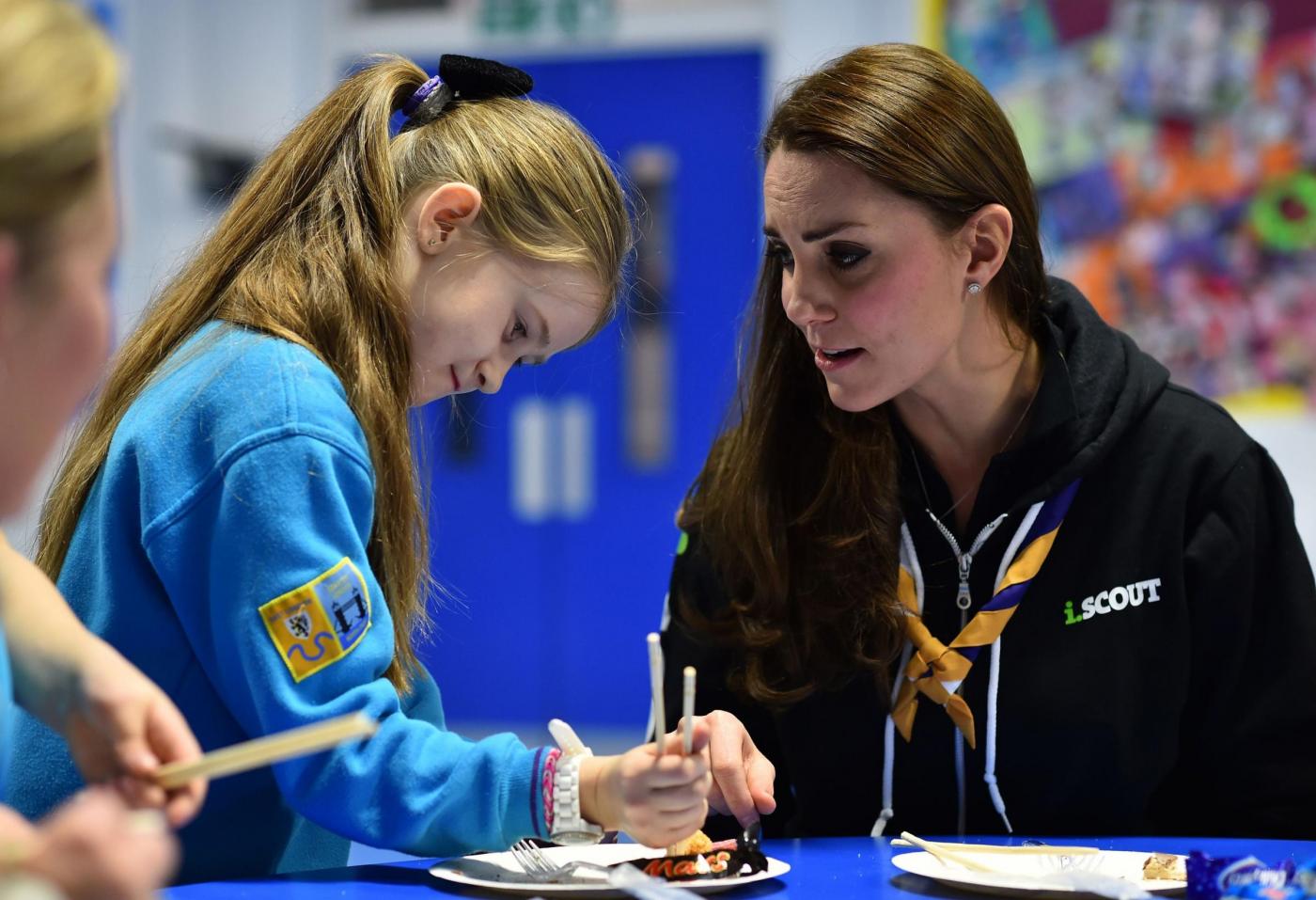 The Duchess of Cambridge teaches a girl how to use chopsticks as she meets with children at the newly established 23rd Poplar Beaver Scout Colony in east London. PRESS ASSOCIATION Photo. Picture date: Tuesday December 16, 2014. Kate’s visit supports the Scout Association's 'Better Prepared' campaign, which aims to help communities to deliver Scouting to two hundred locations across the UK where Scouting can have the biggest impact. Photo credit should read: Ben Stansall/PA Wire