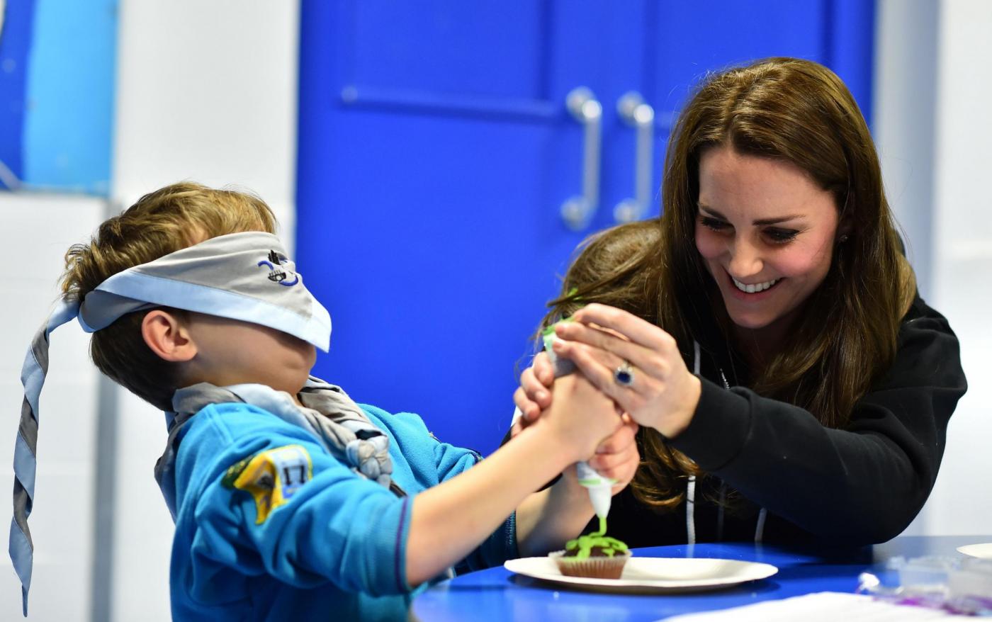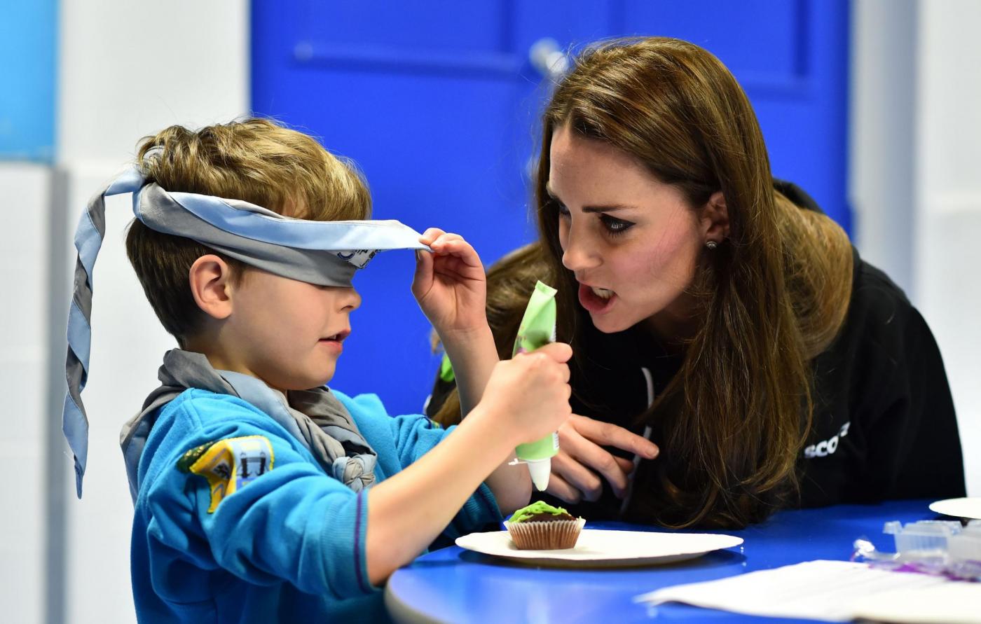 The Duchess of Cambridge helps blindfolded Fynley Gooch, aged seven, ice a cake as she promotes disability awareness when she met with children at the newly established 23rd Poplar Beaver Scout Colony in east London. PRESS ASSOCIATION Photo. Picture date: Tuesday December 16, 2014. Kate’s visit supports the Scout Association's 'Better Prepared' campaign, which aims to help communities to deliver Scouting to two hundred locations across the UK where Scouting can have the biggest impact. Photo credit should read: Ben Stansall/PA Wire