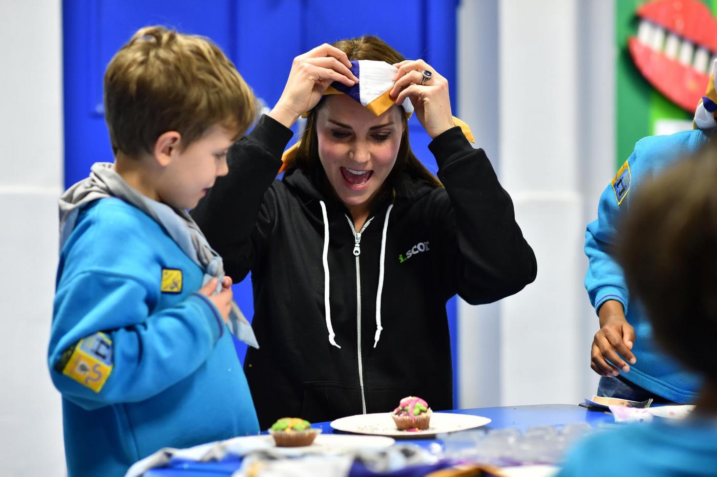 The Duchess of Cambridge, lifts her blindfold, after being helped to ice a cake by Fynley Gooch, aged seven, as she promotes disability awareness when she met with children at the newly established 23rd Poplar Beaver Scout Colony in east London. PRESS ASSOCIATION Photo. Picture date: Tuesday December 16, 2014. Kate’s visit supports the Scout Association's 'Better Prepared' campaign, which aims to help communities to deliver Scouting to two hundred locations across the UK where Scouting can have the biggest impact. Photo credit should read: Ben Stansall/PA Wire