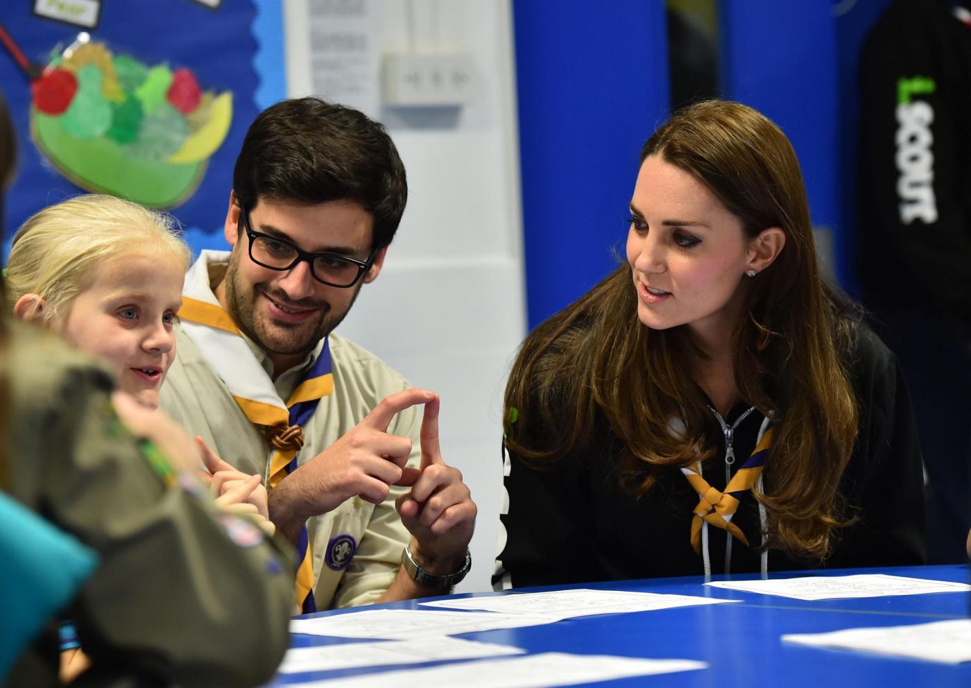 The Duchess of Cambridge sits beside Scout Leader Carlos Lopez-Plandolit (2nd left) as she learns sign language with children at the newly established 23rd Poplar Beaver Scout Colony in east London. PRESS ASSOCIATION Photo. Picture date: Tuesday December 16, 2014. Kate’s visit supports the Scout Association's 'Better Prepared' campaign, which aims to help communities to deliver Scouting to two hundred locations across the UK where Scouting can have the biggest impact. Photo credit should read: Ben Stansall/PA Wire