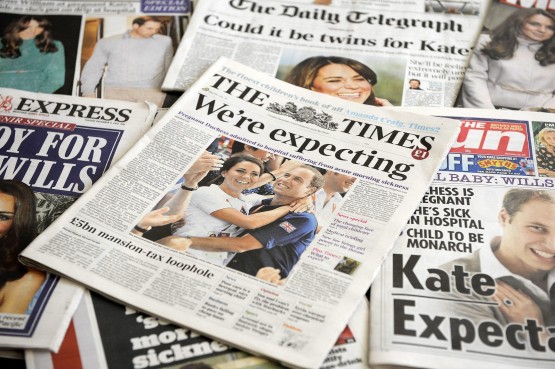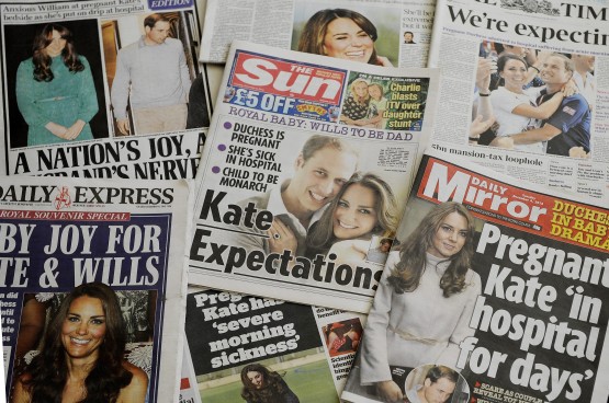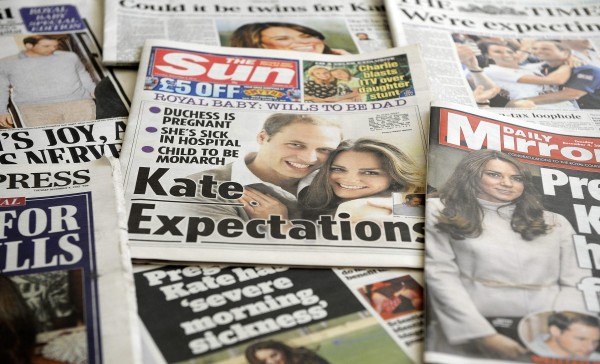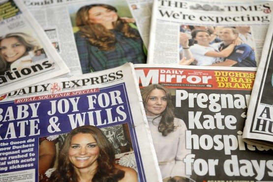 epa03495827 British newspapers shower their front pages with the news of Catherine, the Duchess of Cambridge's pregnancy in London, Britain, 04 December 2012. Britain's Prince William and Catherine are expecting their first child it was revealed 03 December 2012, after the Duchess was admitted to hospital for acute morning sickness. EPA/ANDY RAIN
