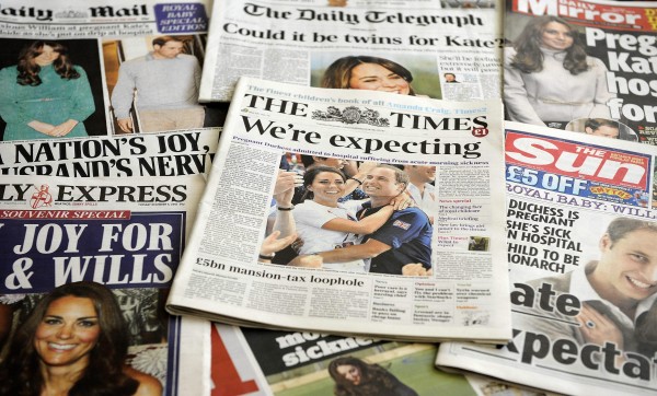 epa03495826 British newspapers shower their front pages with the news of Catherine, the Duchess of Cambridge's pregnancy in London, Britain, 04 December 2012. Britain's Prince William and Catherine are expecting their first child it was revealed 03 December 2012, after the Duchess was admitted to hospital for acute morning sickness. EPA/ANDY RAIN