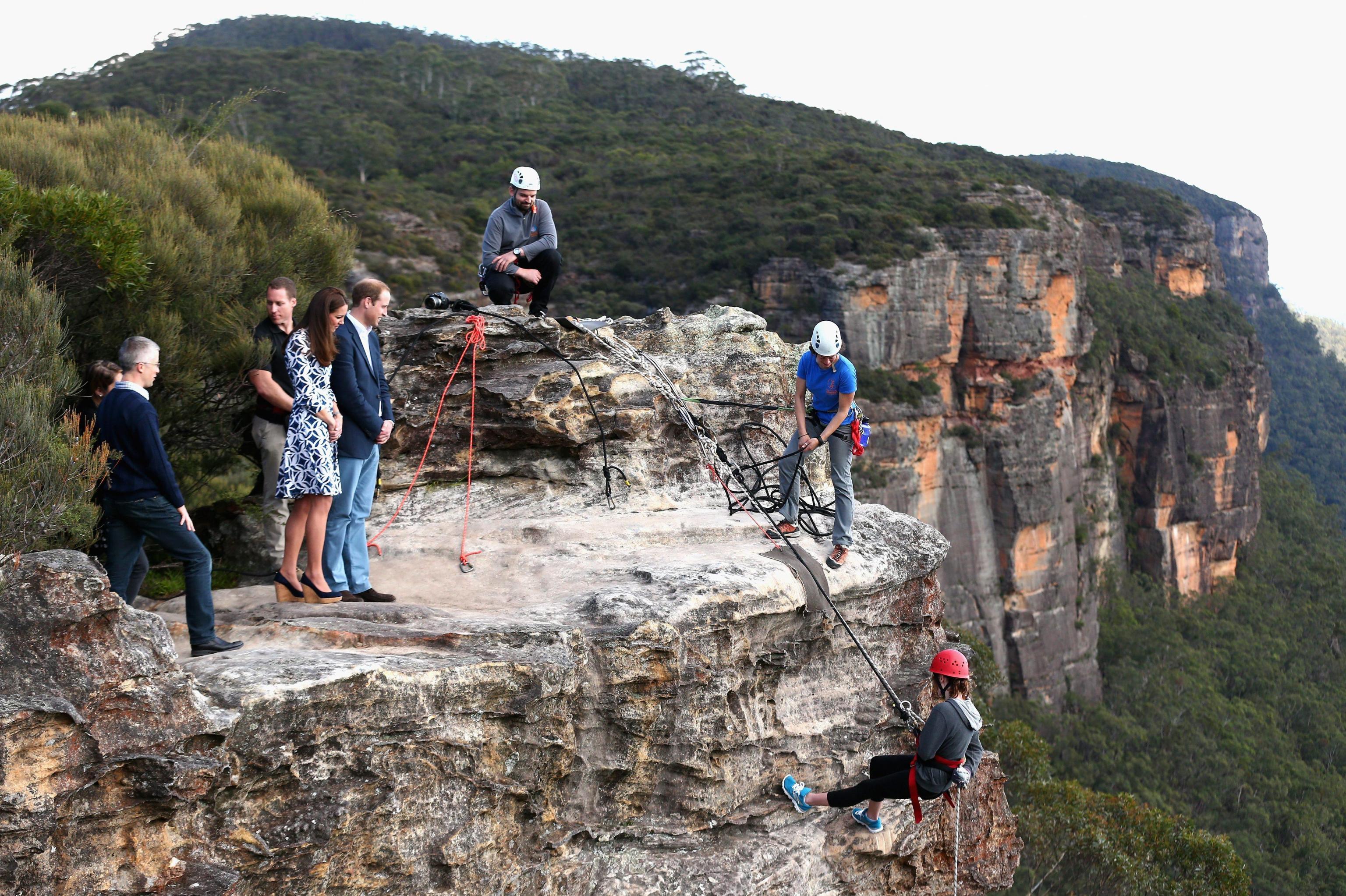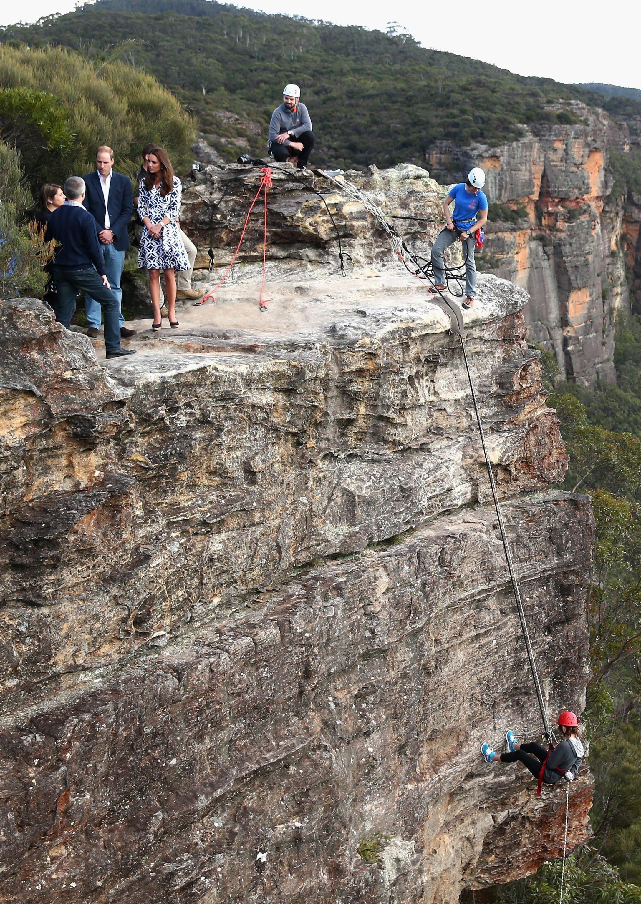 epa04169731 Prince William, Duke of Cambridge, and Catherine, Duchess of Cambridge, observe abseiling and team building exercises at Narrow Neck Lookout on April 17, 2014 in Katoomba, Australia. The Duke and Duchess of Cambridge are on a three-week tour of Australia and New Zealand, the first official trip overseas with their son, Prince George of Cambridge. EPA/Ryan Pierse