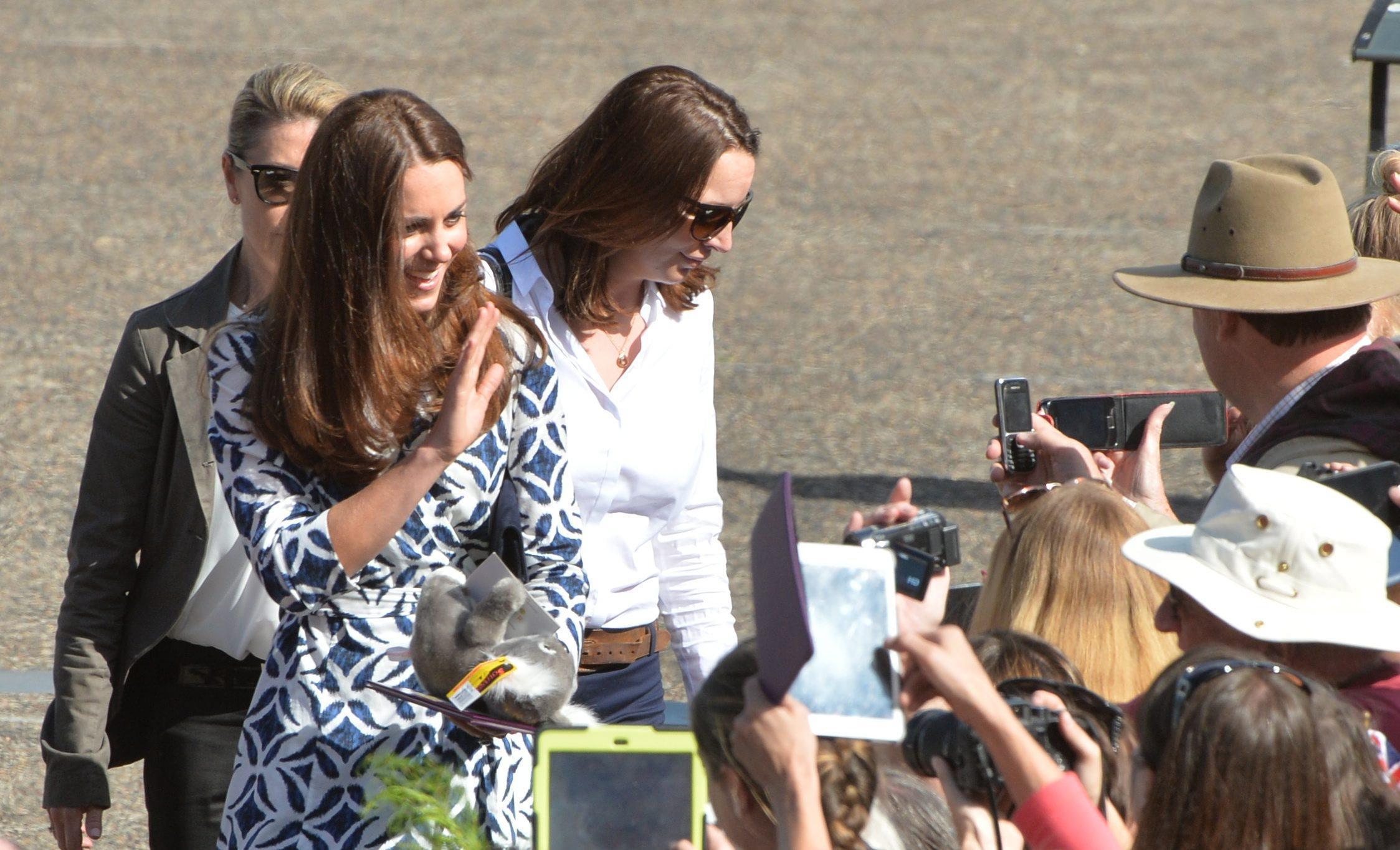 epa04169728 Catherine, Duchess of Cambridge, waves to the crowd during a visit to Echo Point with Prince William (not in picture) to see the Three Sisters in Katoomba in the Blue Mountains, west of Sydney, Thursday, April 17, 2014. Prince William and Catherine met with residents earlier in Winmalee who lost their homes in the devastating October bush fires during a tour of the region. EPA/DEAN LEWINS AUSTRALIA AND NEW ZEALAND OUT