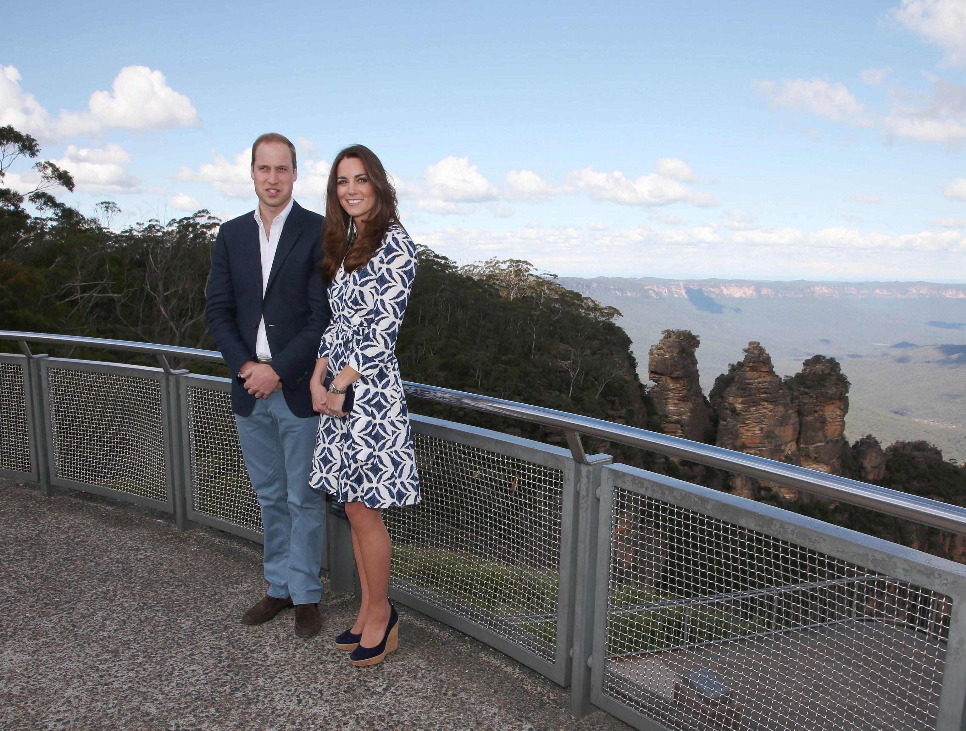 epa04169729 Britain's Prince William, left, and his wife, Kate, Duchess of Cambridge, pose in front of the Three Sisters rock formation in the Blue Mountains during a tour of Echo Point in Katoomba, , April 17, 2014. The royal couple, along with Prince George, are on the 10-day official visit EPA/Rick Rycroft POOL