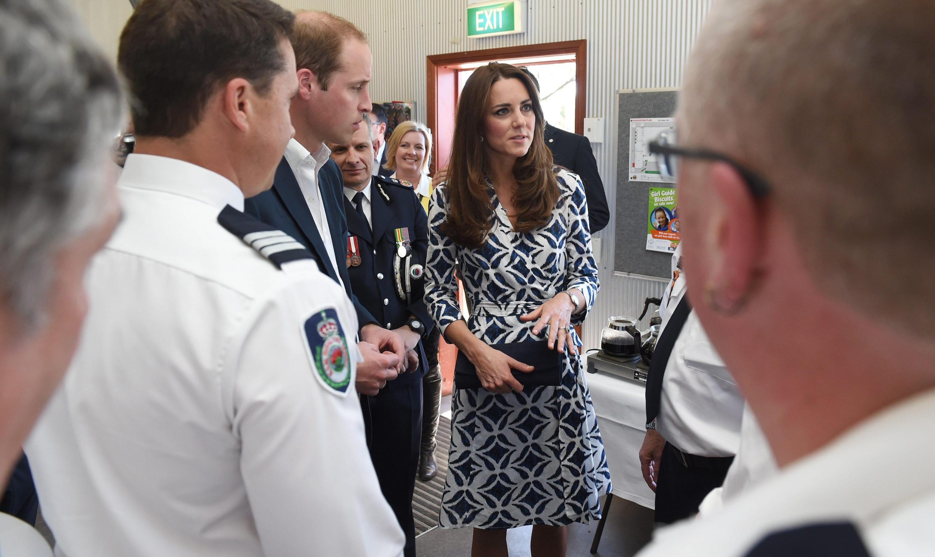 epa04169640 Britain's Prince William (3-L) and his wife Catherine, the Duchess of Cambridge (C), meet with emergency services personnel, in an area in the Blue Mountains heavily affected by bushfires, at Winmalee, Australia, 17 April 2014. William, his wife Kate and their son Prince George are on a three-week tour of New Zealand and Australia. EPA/WILLIAM WEST / POOL AUSTRALIA AND NEW ZEALAND OUT