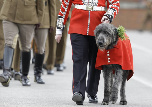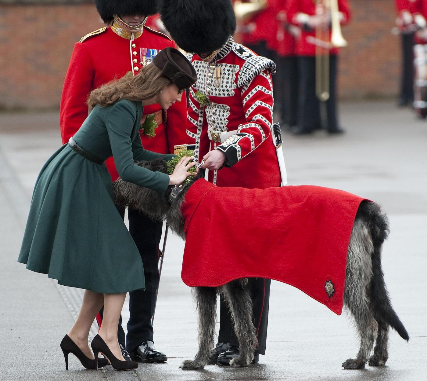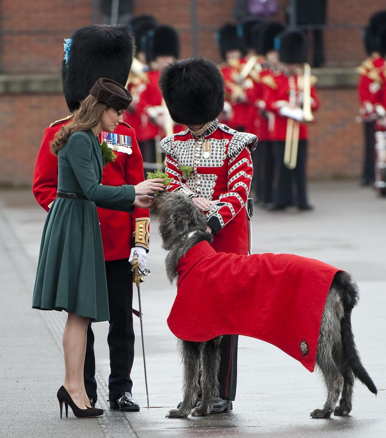 aldershot (regno unito) – Kate Middleton ha festeggiato San Patrizio, il santo patrono d’Irlanda, appuntando un trifoglio sul muso di Domhnall, il levriero irlandese mascotte del 1° Battaglione delle Guardie Irlandesi.