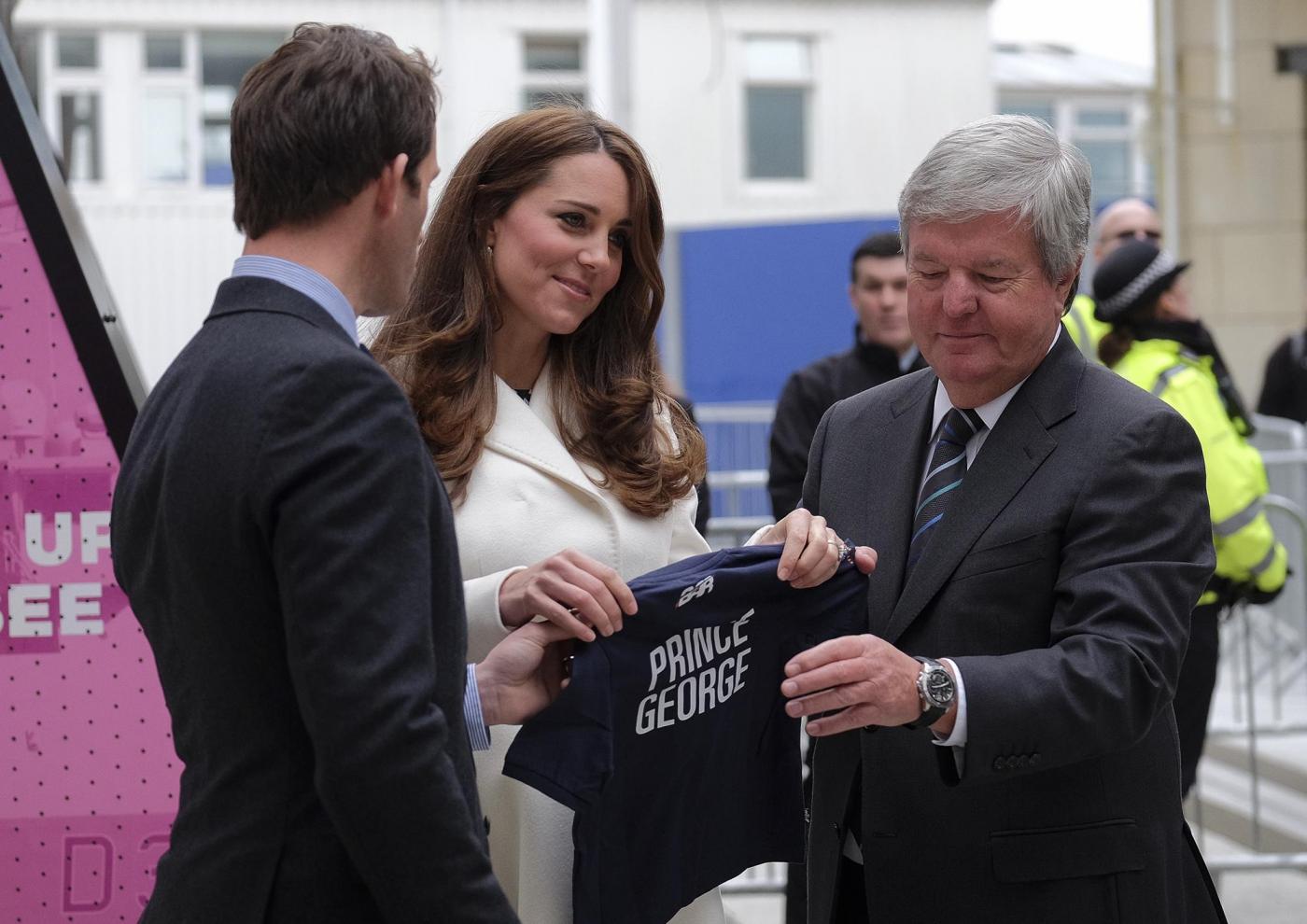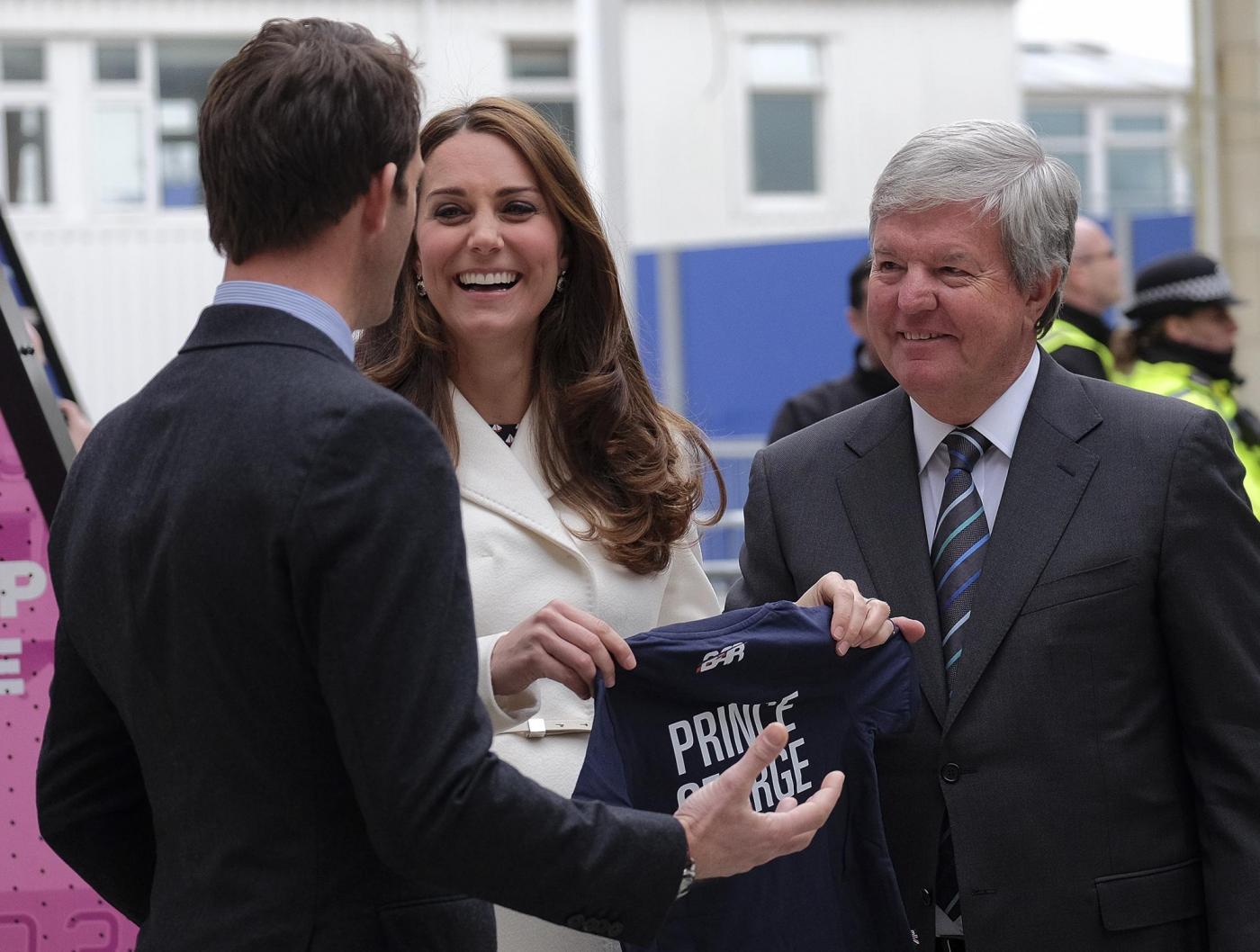The Duchess of Cambridge, patron of the 1851 Trust, accepts a Ben Ainslie Racing sailing shirt with Prince George written on the back, during a visit to Portsmouth to see the progress of building work on the new home of Ben Ainslie Racing as part of a British America's Cup entry at the Spinnaker Tower in Portsmouth. PRESS ASSOCIATION Photo. Picture date: Thursday February 12, 2015. See PA story ROYAL Kate. Photo credit should read: Christopher Pledger/Daily Telegr/PA Wire