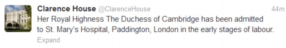 Il tweet spiega che “sua altezza reale” la duchessa di Cambridge è stata portata in ospedale “alle prime fasi del travaglio”. Insomma, l’annuncio della nascita potrebbe arrivare tra ore, ma Clarence House informerà in diretta.