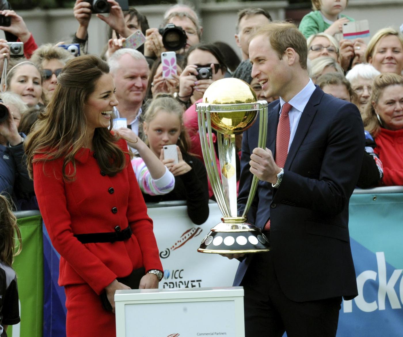 Britain's Prince William holds the Cricket World Cup trophy as his wife Kate, the Duchess of Cambridge, smiles during a promotional event at Latimer Square during their visit to Christchurch, New Zealand, Monday, April 14, 2014. (AP Photo/SNPA, Ross Setford) NEW ZEALAND OUT