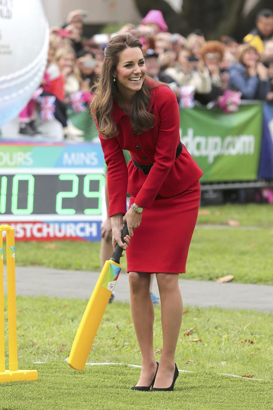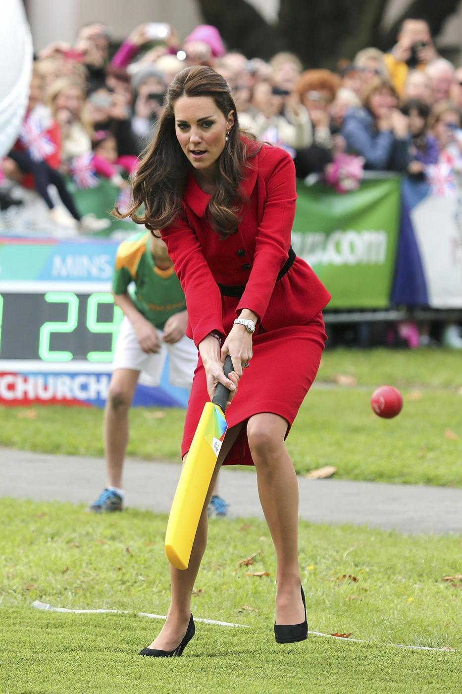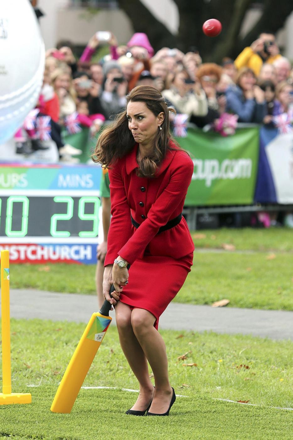 Britain's Kate, the Duchess of Cambridge, plays cricket in Latimer Square in Christchurch, New Zealand, Monday, April 14, 2014. Prince William and his wife Kate are on a three-week tour of New Zealand and Australia with their son, Prince George. (AP Photo/Martin Hunter, Pool)