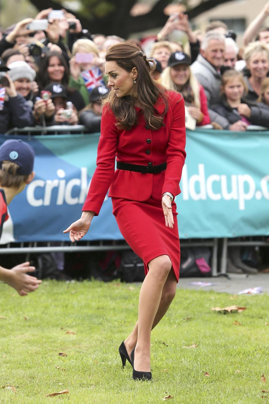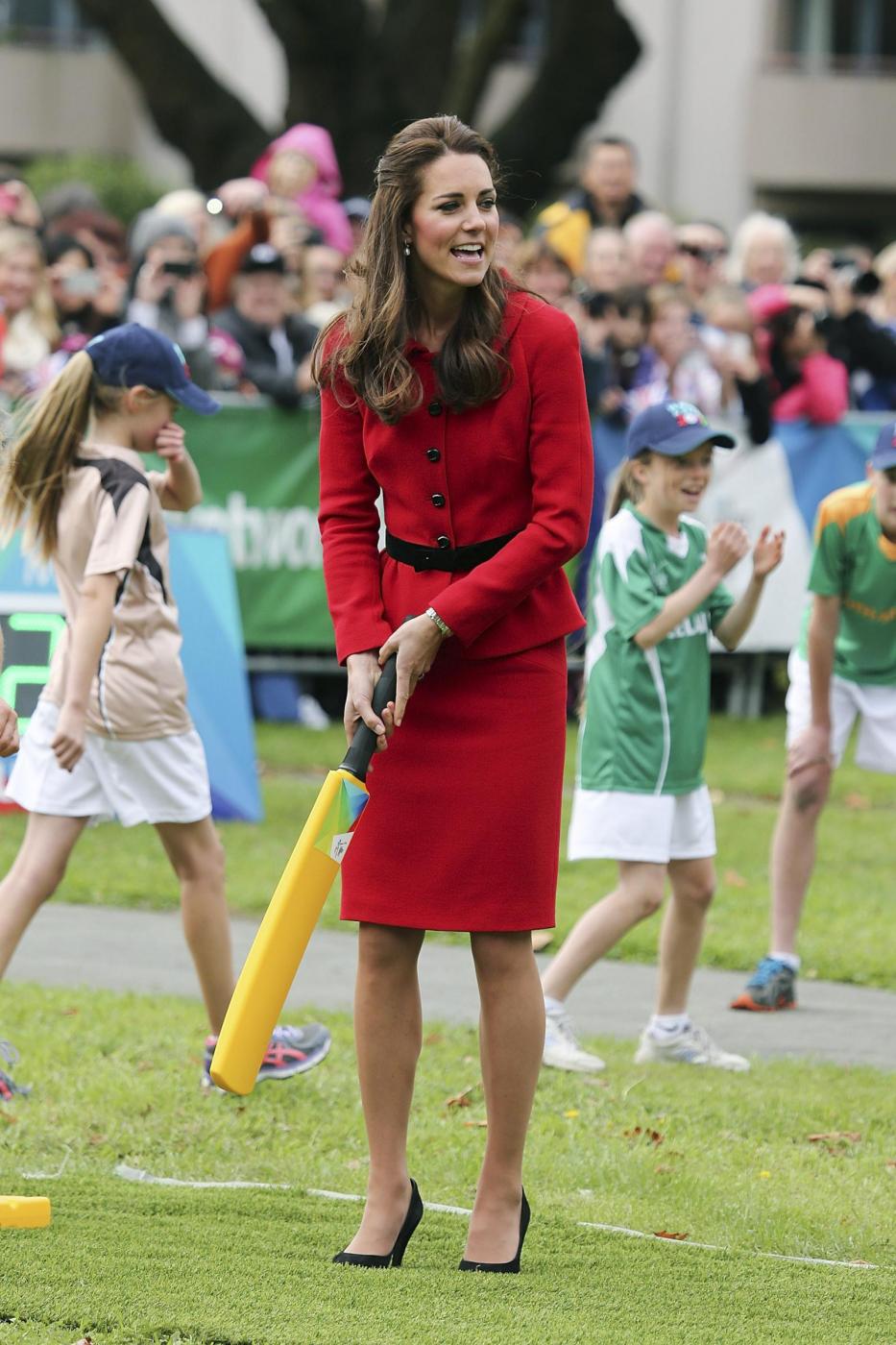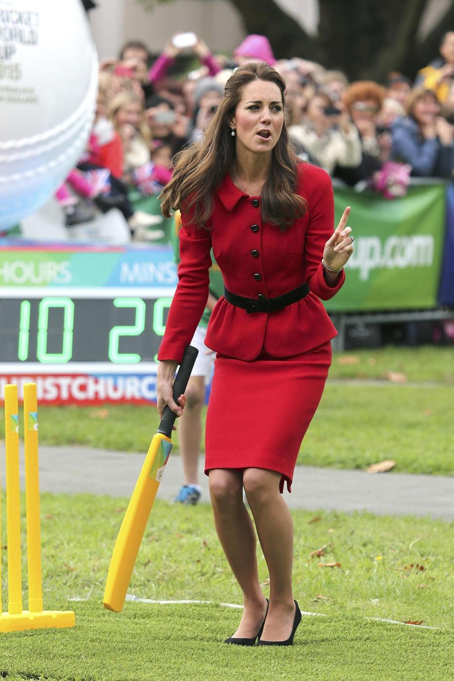Britain's Kate, the Duchess of Cambridge, plays cricket in Latimer Square in Christchurch, New Zealand, Monday, April 14, 2014. Prince William and his wife Kate are on a three-week tour of New Zealand and Australia with their son, Prince George. (AP Photo/Martin Hunter, Pool)