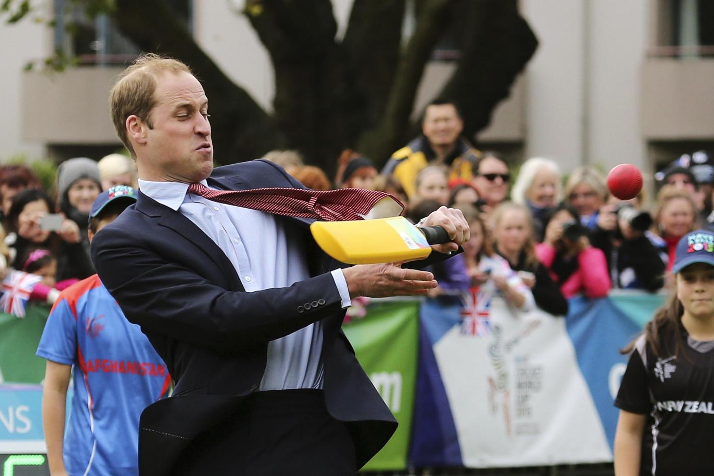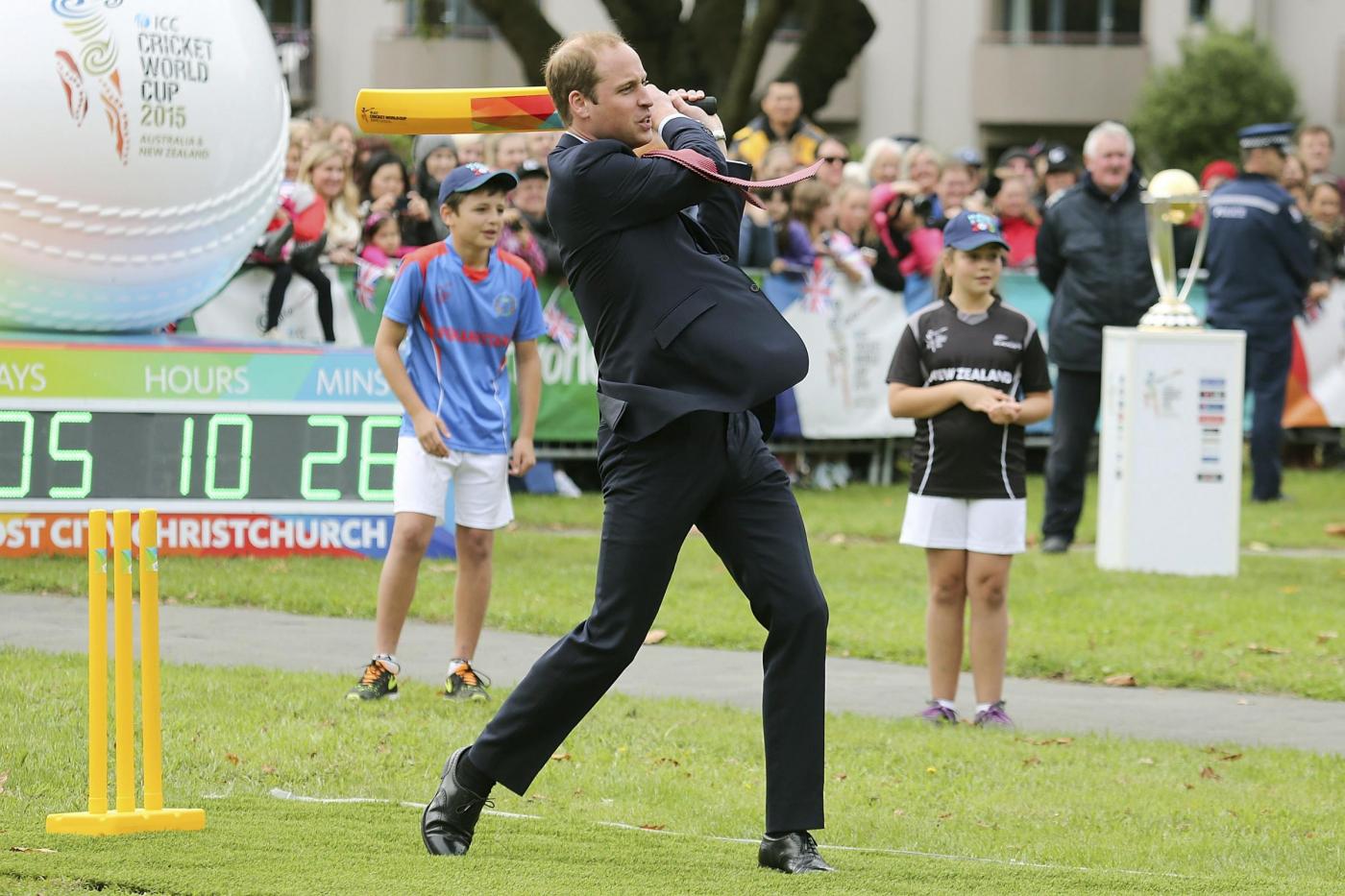 Britain's Prince William plays cricket in Latimer Square in Christchurch, New Zealand, Monday, April 14, 2014. William and his wife Kate, the Duchess of Cambridge, are on a three-week tour of New Zealand and Australia with their son, Prince George. (AP Photo/Martin Hunter, Pool)