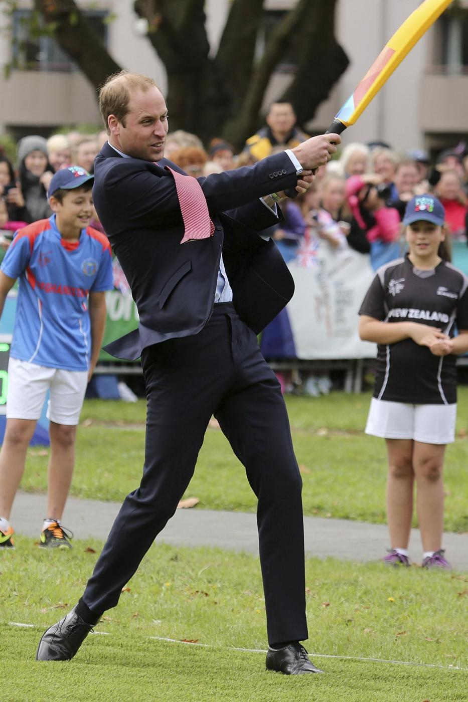 Britain's Prince William plays cricket in Latimer Square in Christchurch, New Zealand, Monday, April 14, 2014. Prince William and his wife Kate, the Duchess of Cambridge, are on a three-week tour of New Zealand and Australia with their son, Prince George. (AP Photo/Martin Hunter, Pool)