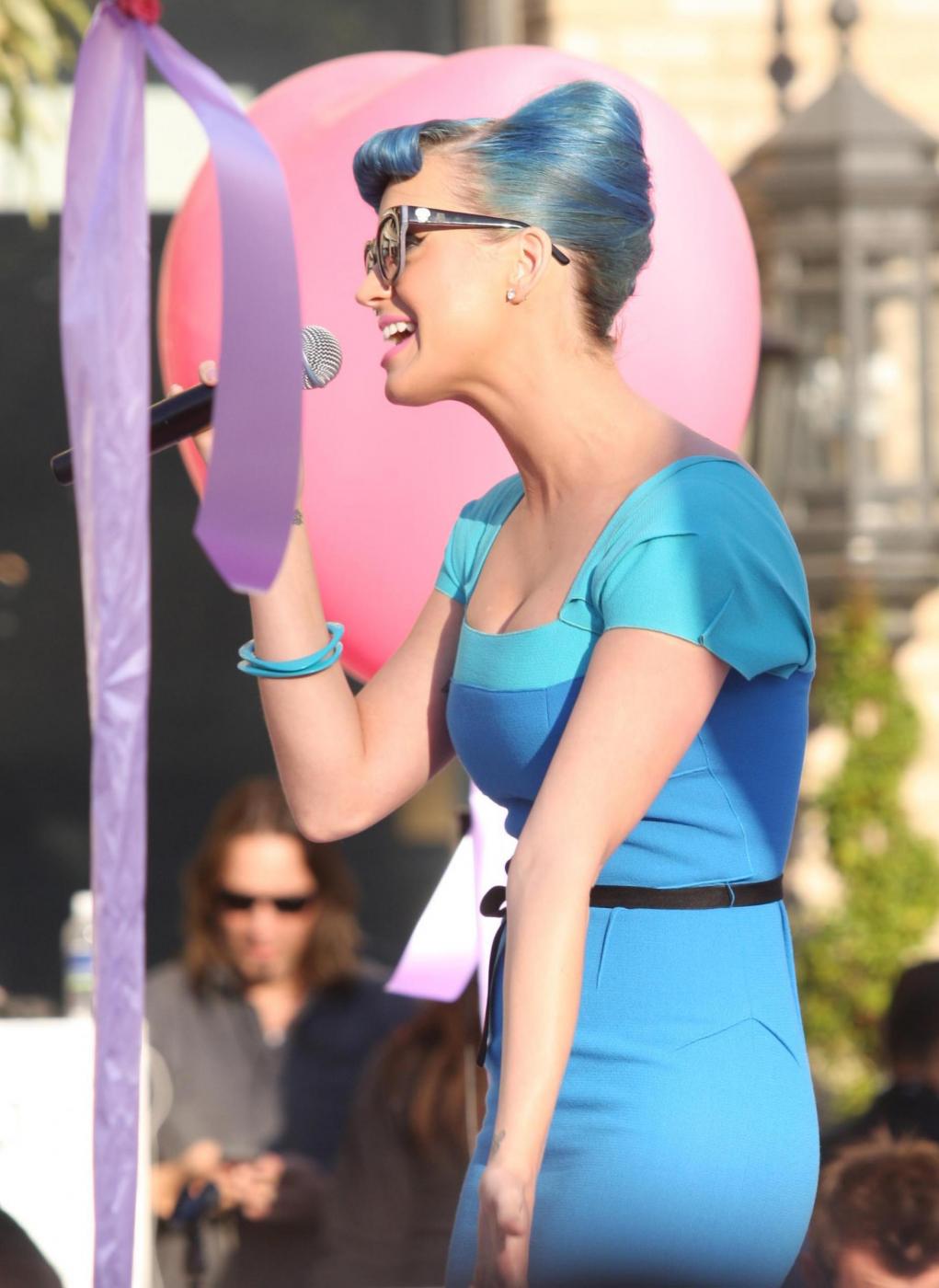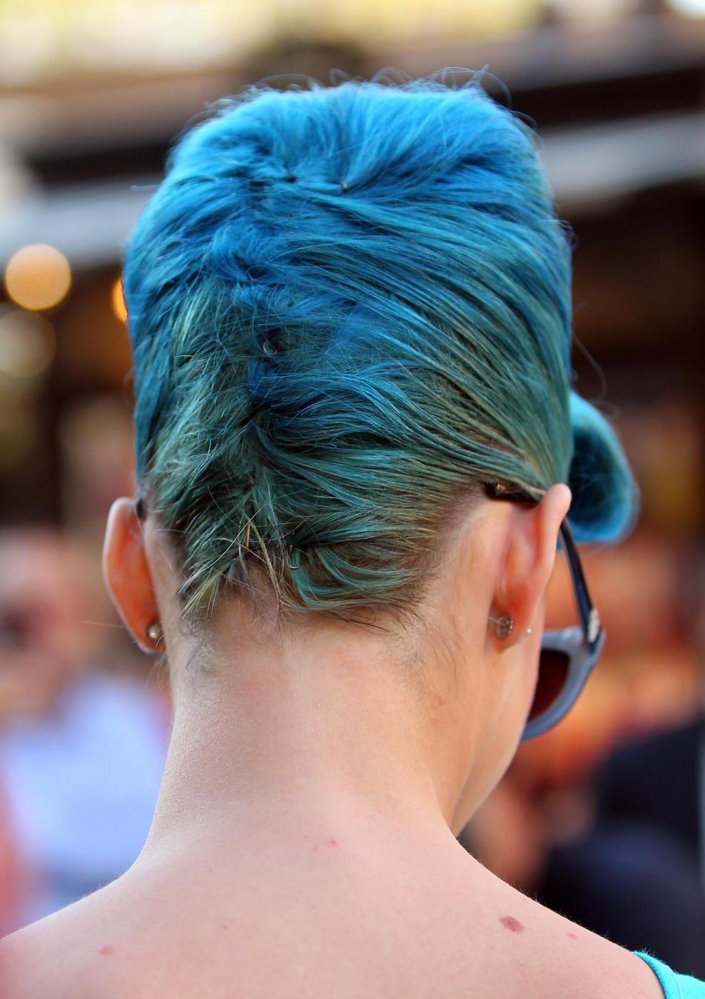 Durante la presentazione avvenuta all’Ulta Beauty stores di Glendale in California, Katy Perry ha sfoggiato una frangetta azzurra e delle scarpe con la zeppa dello stesso colore (foto Ap/LaPresse):