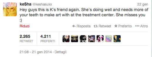 LOS ANGELES – Kesha è un’artista bizzarra, che negli ultimi anni ha abituato i suoi fan a ogni genere di stranezza. Ora si trova in rehab per curare le sue dipendenze ma mantiene i contatti con i suoi fan via Twitter. A volte scrive in prima persona, a volte membri del suo staff.