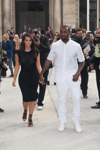 PARIGI – Tradizione vuole che al defilé di un determinato stilista ci si vesta con abiti della sua collezione. Probabile che Kim Kardashian in queste foto scattate a Parigi per la collezione Valentino per l’inverno 2013 sia vestita con un abito dello stilista. Ma, soprattutto visto il suo compagno, non riesce a ingranare il look. Il tubino nero in chiffon con pizzo in trasparenza è elegante ed essenziale. Peccato per l’abbinata con i sandali dai mille listini che si inerpicano lungo le (corte) gambe della Kardashian. Non potendo contare su altezza e magrezza da modella, la Kardashian cade sull’accessorio. E passiamo al compagno, Kanye West. D’accordo, in America la camicia a mezze maniche è chic, vedi le mille varianti indossate da George Clooney. Ma qui siamo in Europa, a Parigi, alla sfilata di Valentino. Era proprio necessario presentarsi con un look degno di un massaggiatore professionista? (Foto Lapresse).